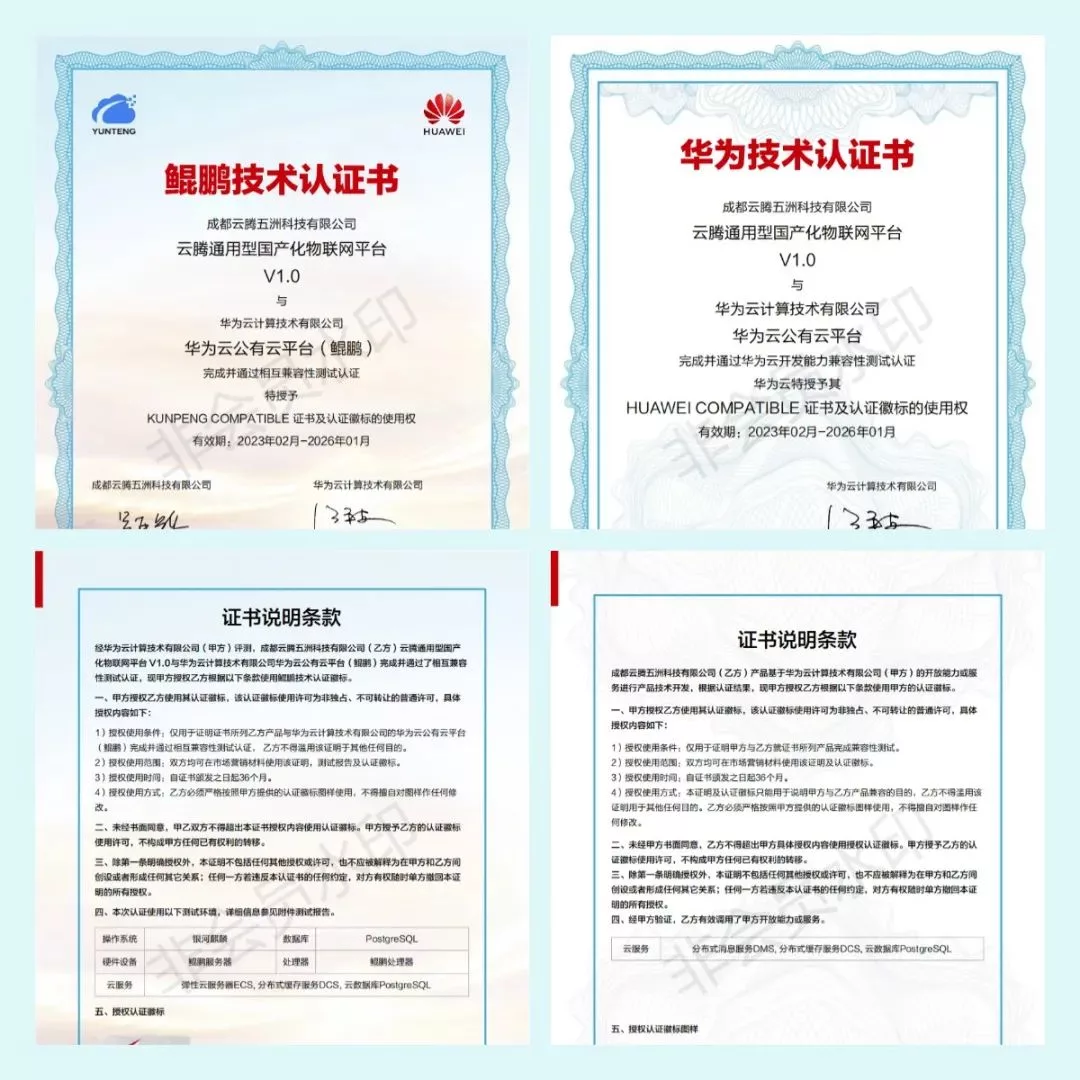 为了适应国产化浪潮,成都云腾五洲科技推出信创版物联网平台产品“ ThingsKit ”,是基于openEuler操作系统,通过了华为的鲲鹏生态兼容性测试认证和华为技术认证,并取得了KUNPENG COMPATIBLE和HUAWEI COMPATIBLE证书及认证徽标的使用权。
