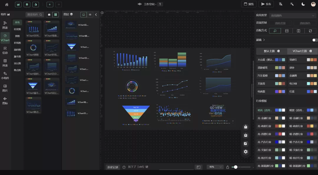 丰富的可视化组件:提供多种图表类型,包括柱状图、折线图、饼图、地图等,满足不同数据展示需求。
