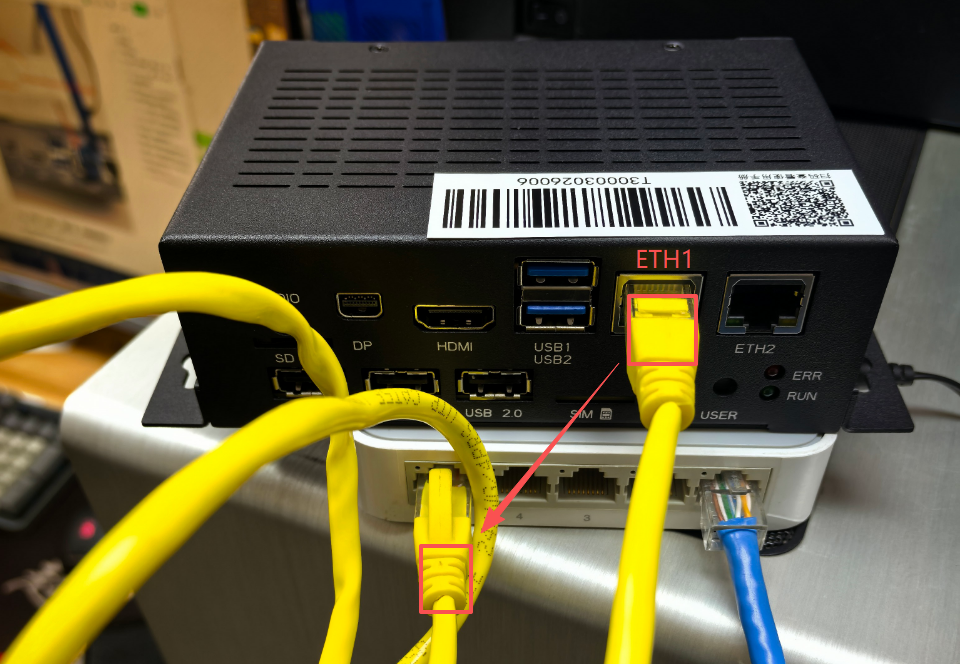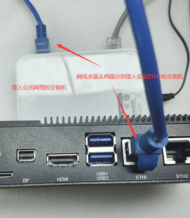 接线:用以太网网线将【交换机网口/路由器】和【设备的ETH1(WAN)网口】相连