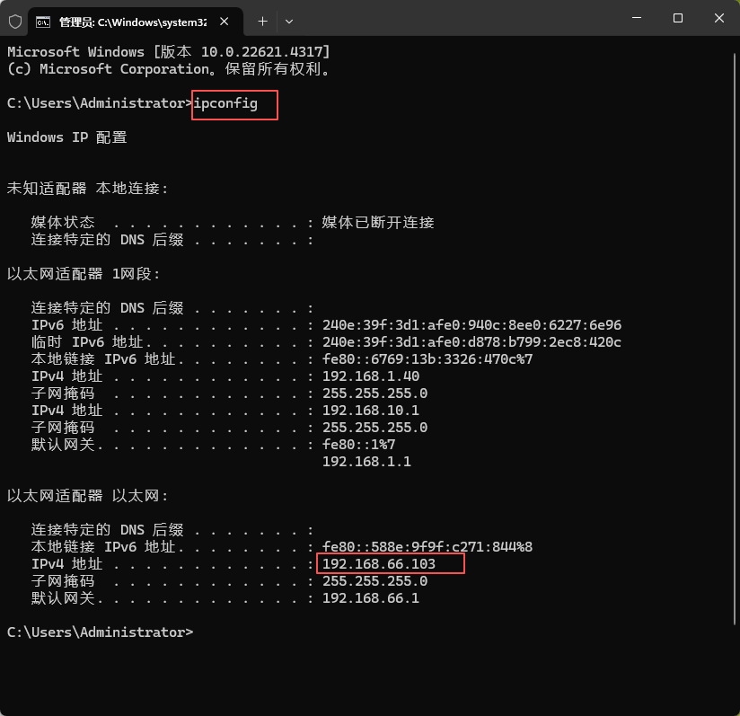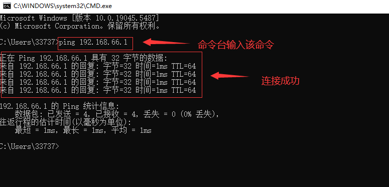通过命令【ipconfig】查看你的电脑IP;如果能获取到【192.168.66.xxx】说明连接成功。