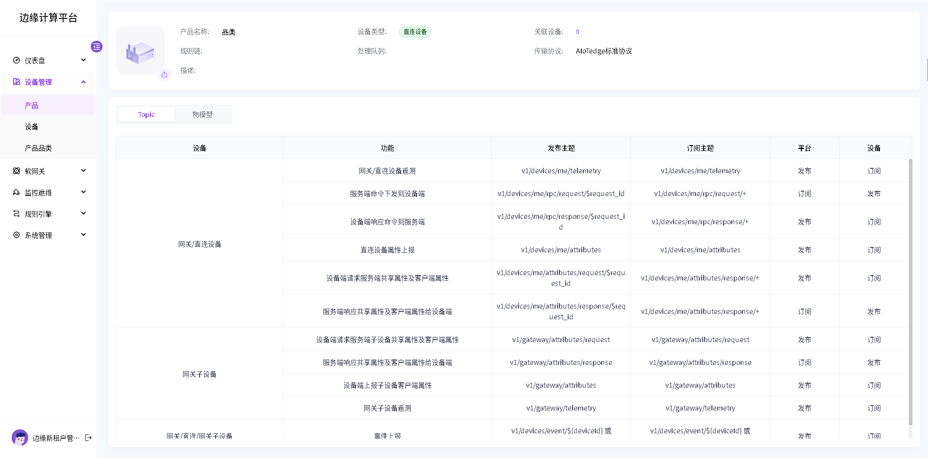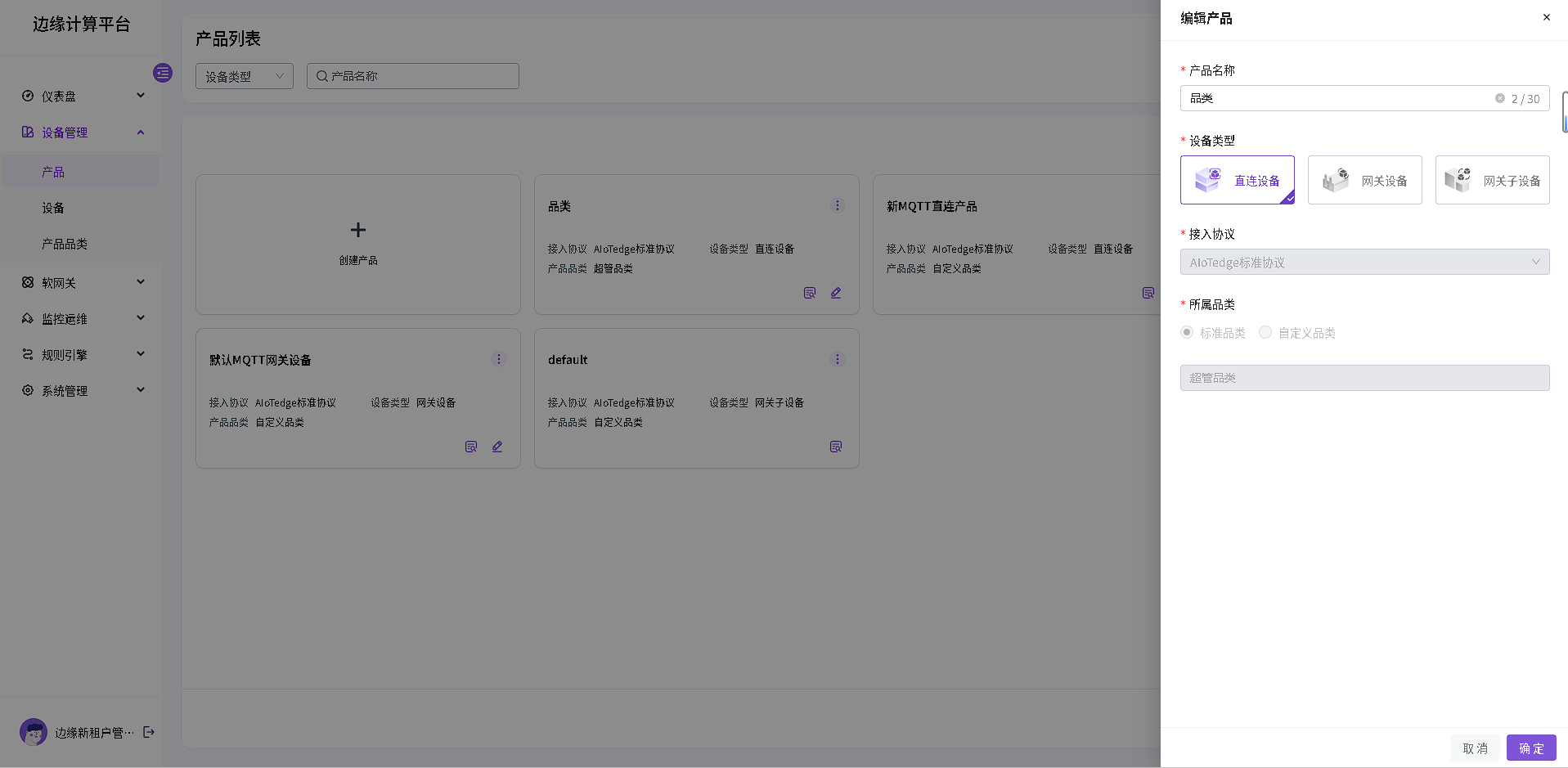 产品名称不可重复,三种协议类型(直连,网关,网关子),所属品类可引用系统标准品类,自定义品类。