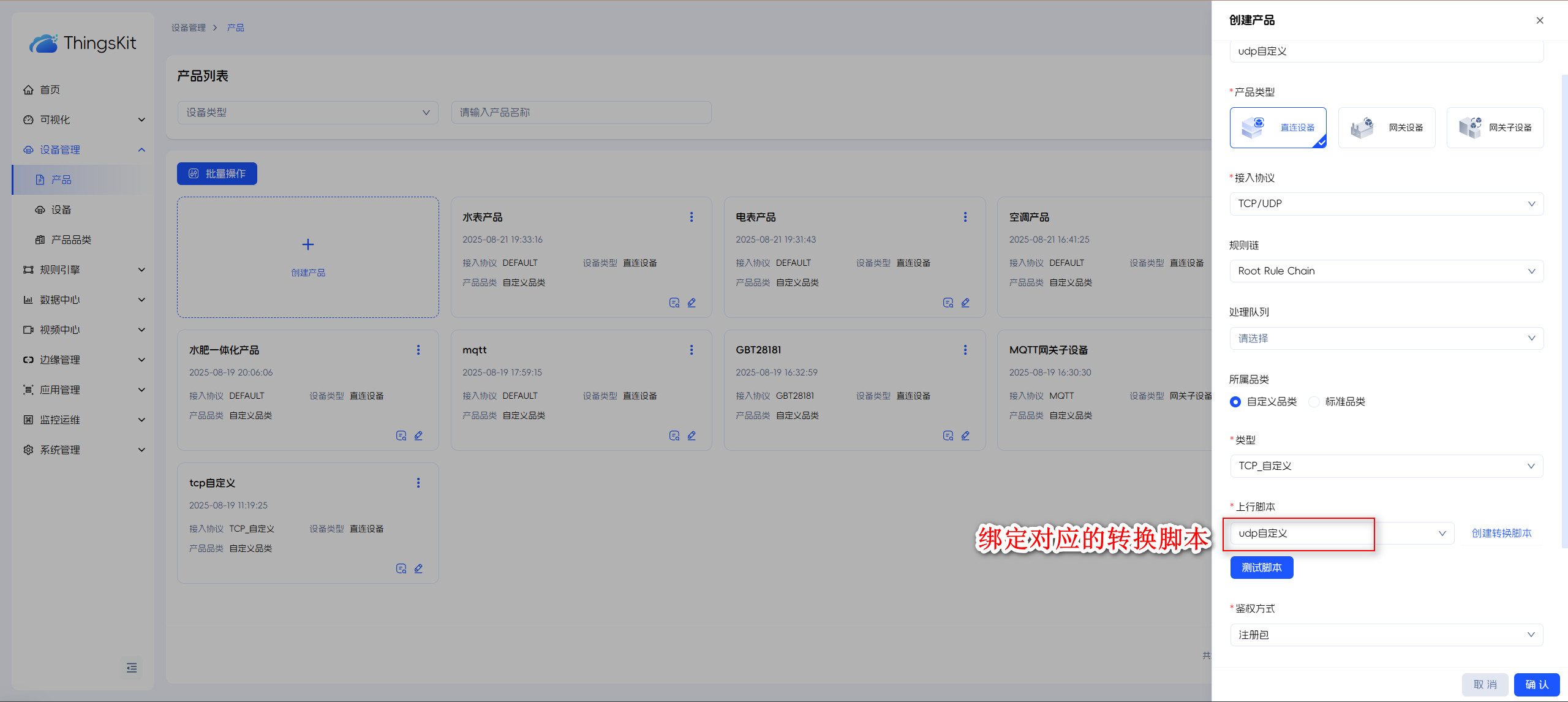 设备接入时,咱们得先创建UDP协议的产品,产品创建时,需要绑定对应的转换脚本。