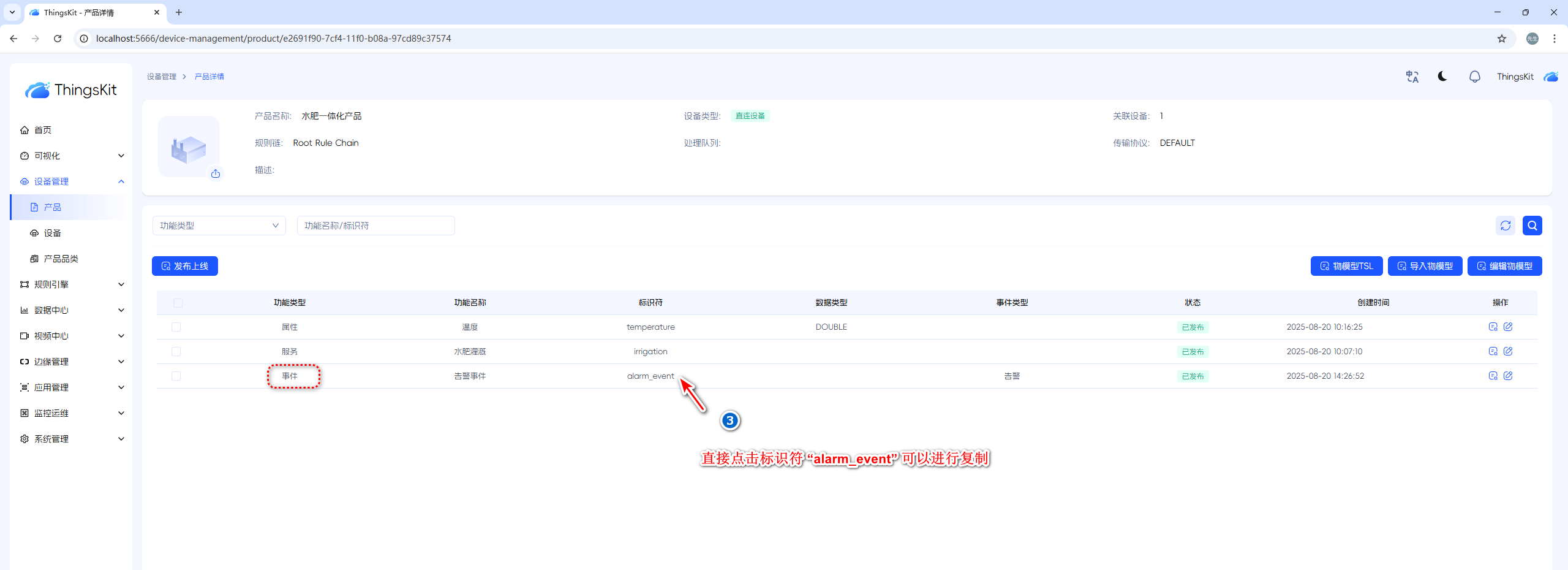 产品的物模型事件已创建,具体操作请通过创建事件进行查看。产品对应的设备已经正常创建,具体操作请通过进行查看创建直连或网关设备进行查看。