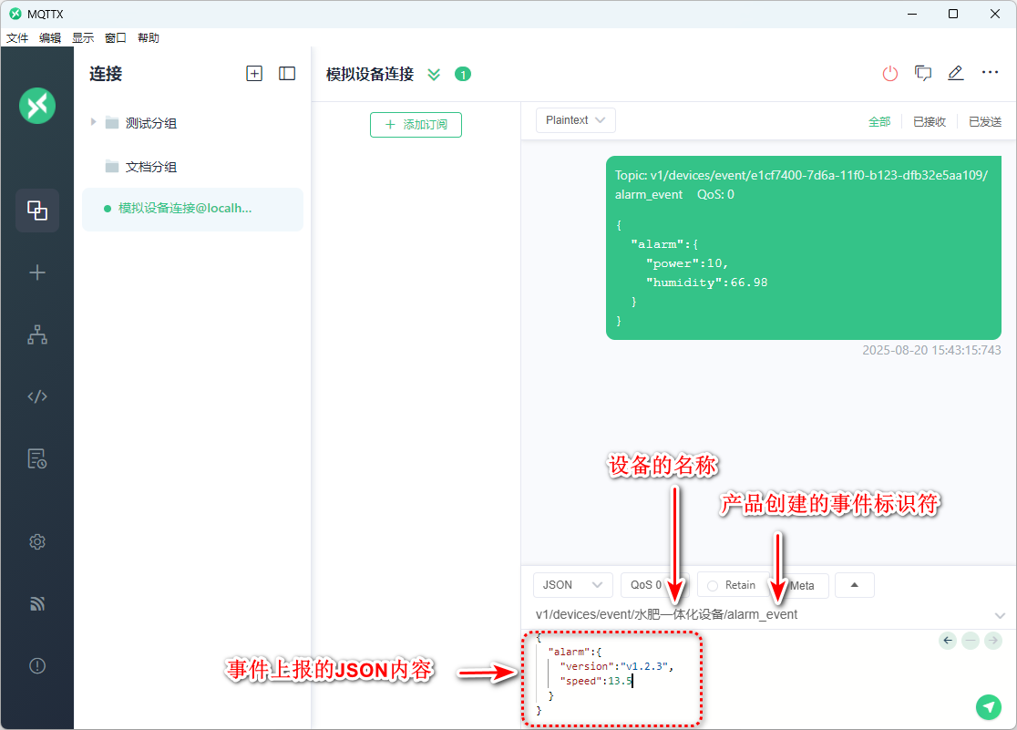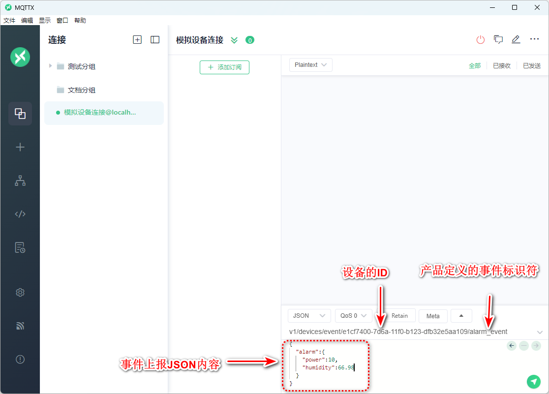 以下是MQTT直连设备上报的示例,如果网关要上报网关子设备的事件,把ID或名称换为子设备的名称即可