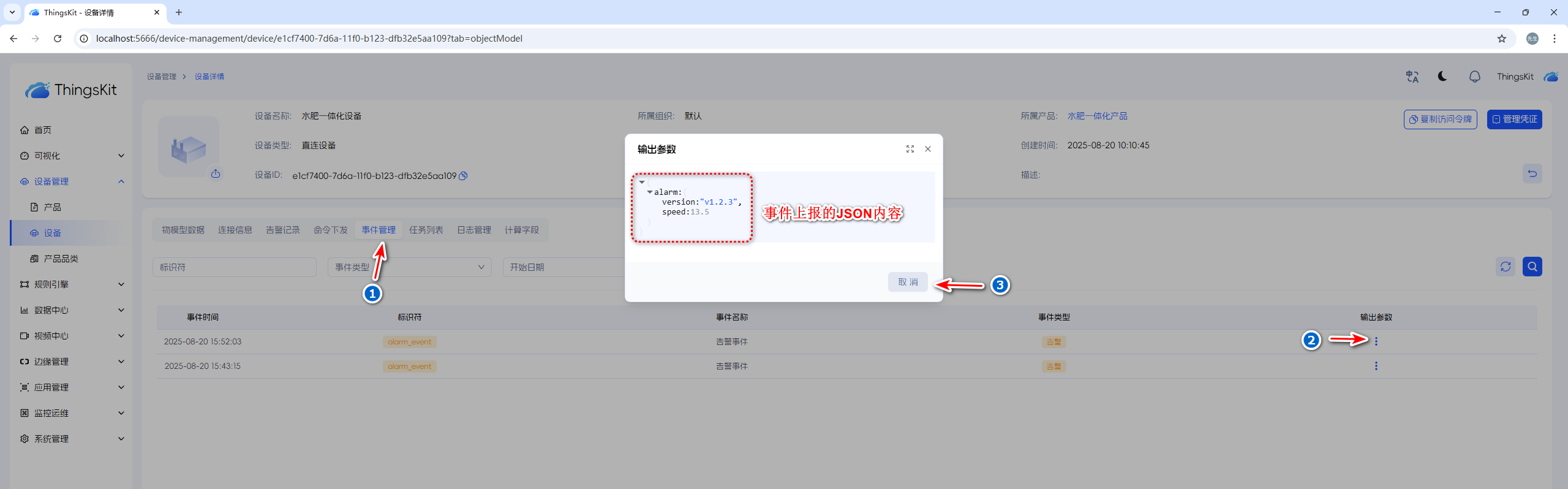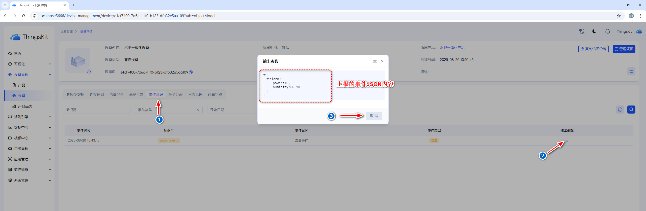 查看上报结果,设备详情 > 事件管理 > 输出参数