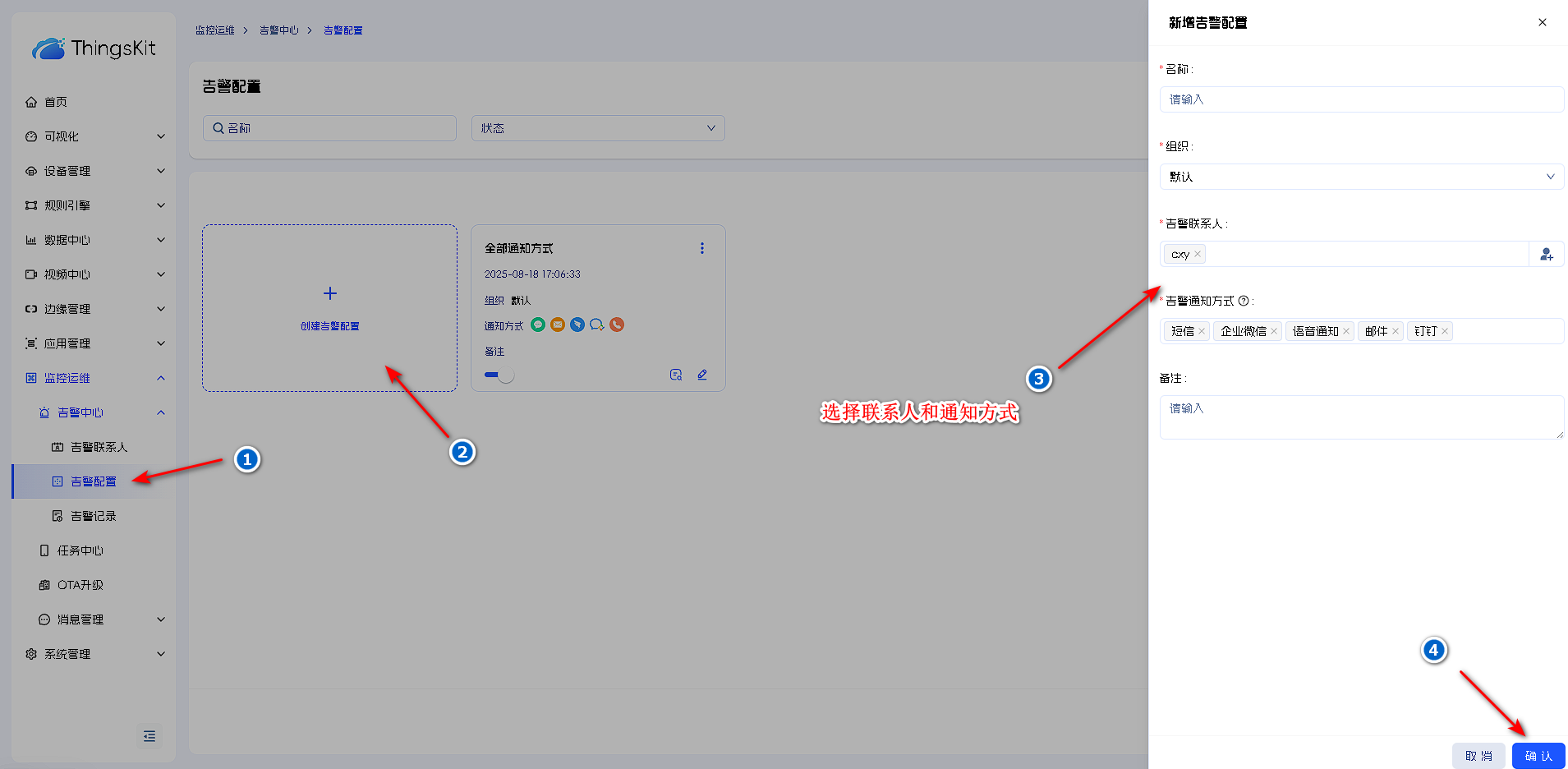 告警配置中的通知方式实现需在消息管理里面配置好消息配置和消息模板才能生效。