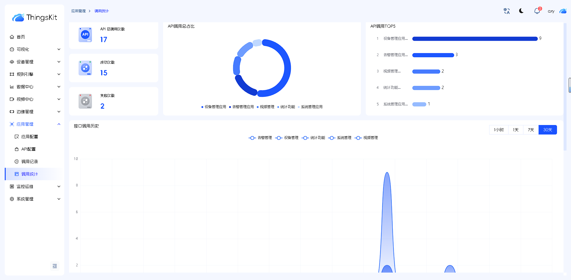 显示多应用,多分类,多API接口调用后的统计界面。接口调用历史可选择时间区间进行查询。