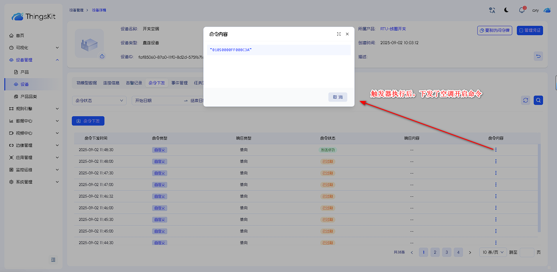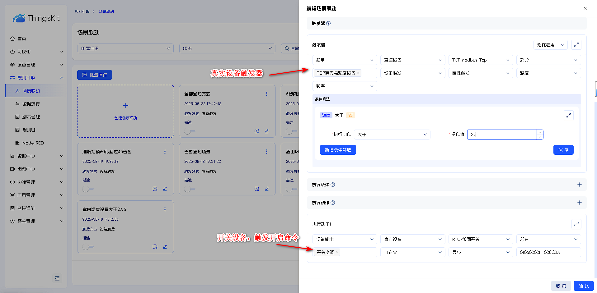 开关空调设备也处于在线状态,场景联动中配置触发器和执行开关动作下发。启用场景联动。