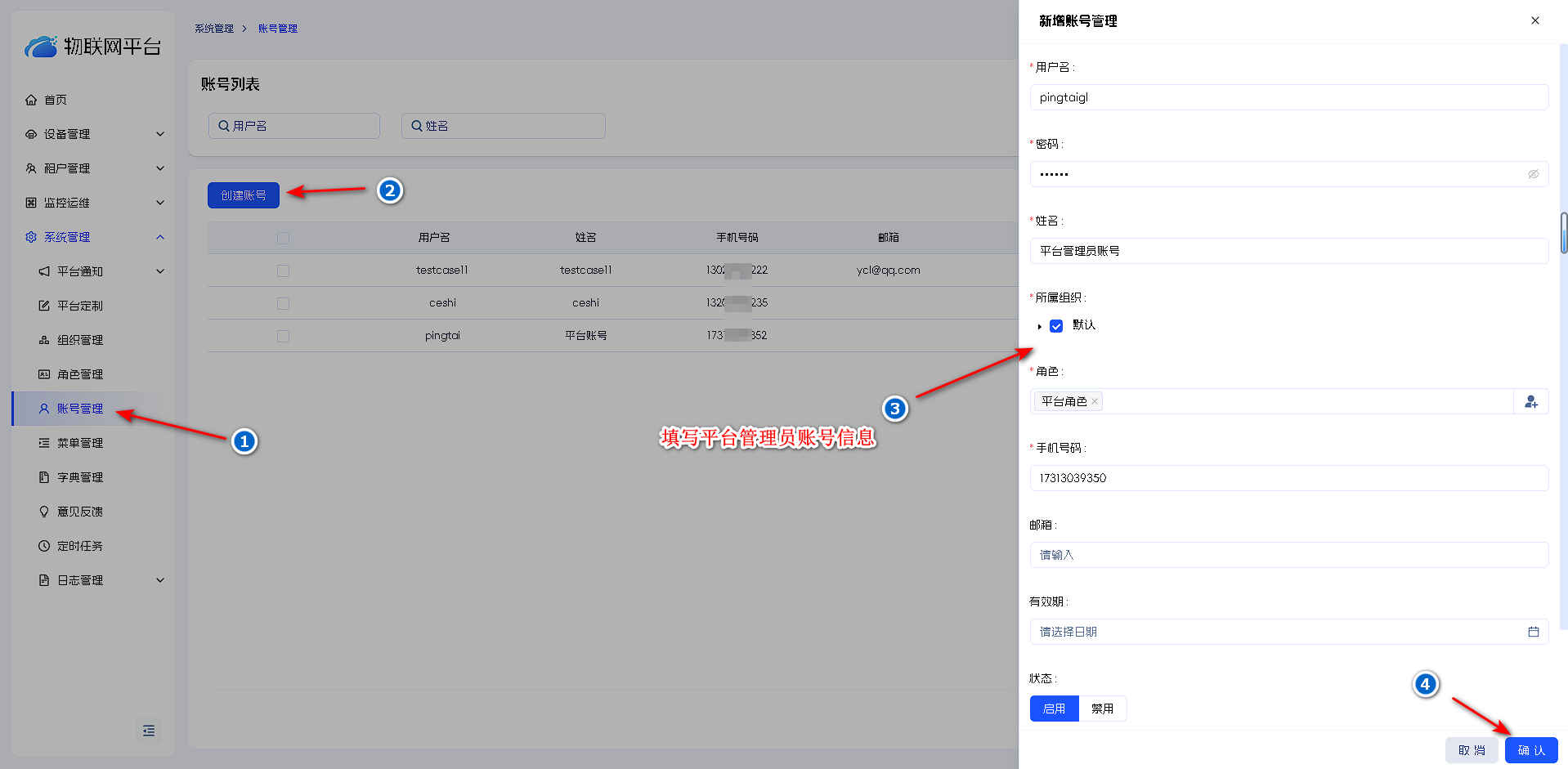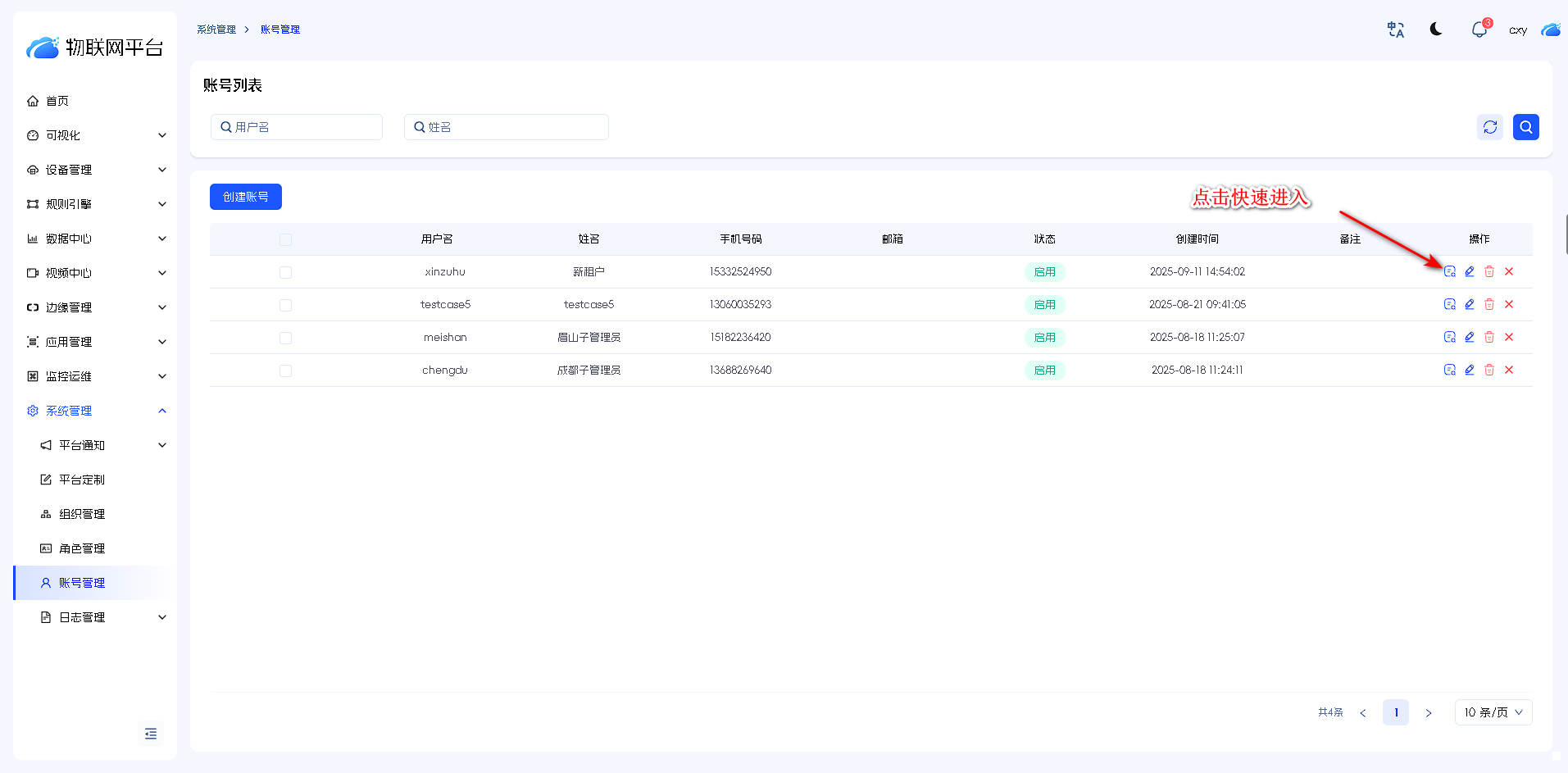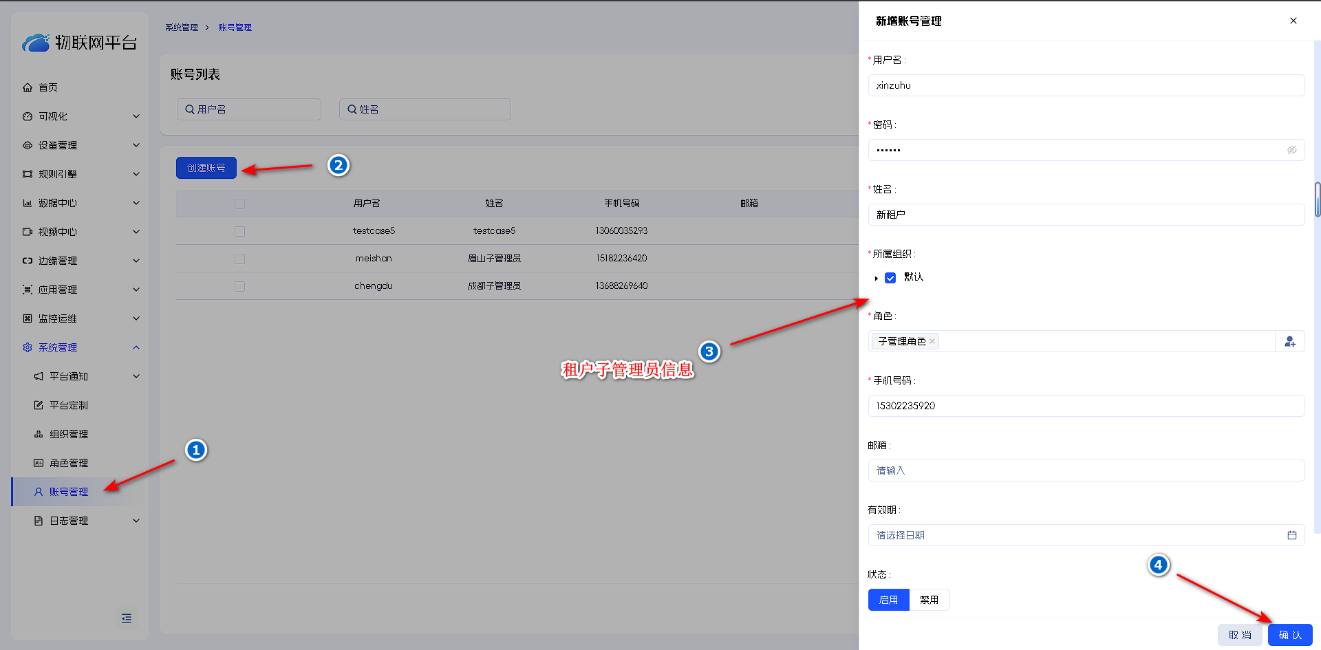 分为超级管理员下面的账号管理和租户管理员下面的账号管理。