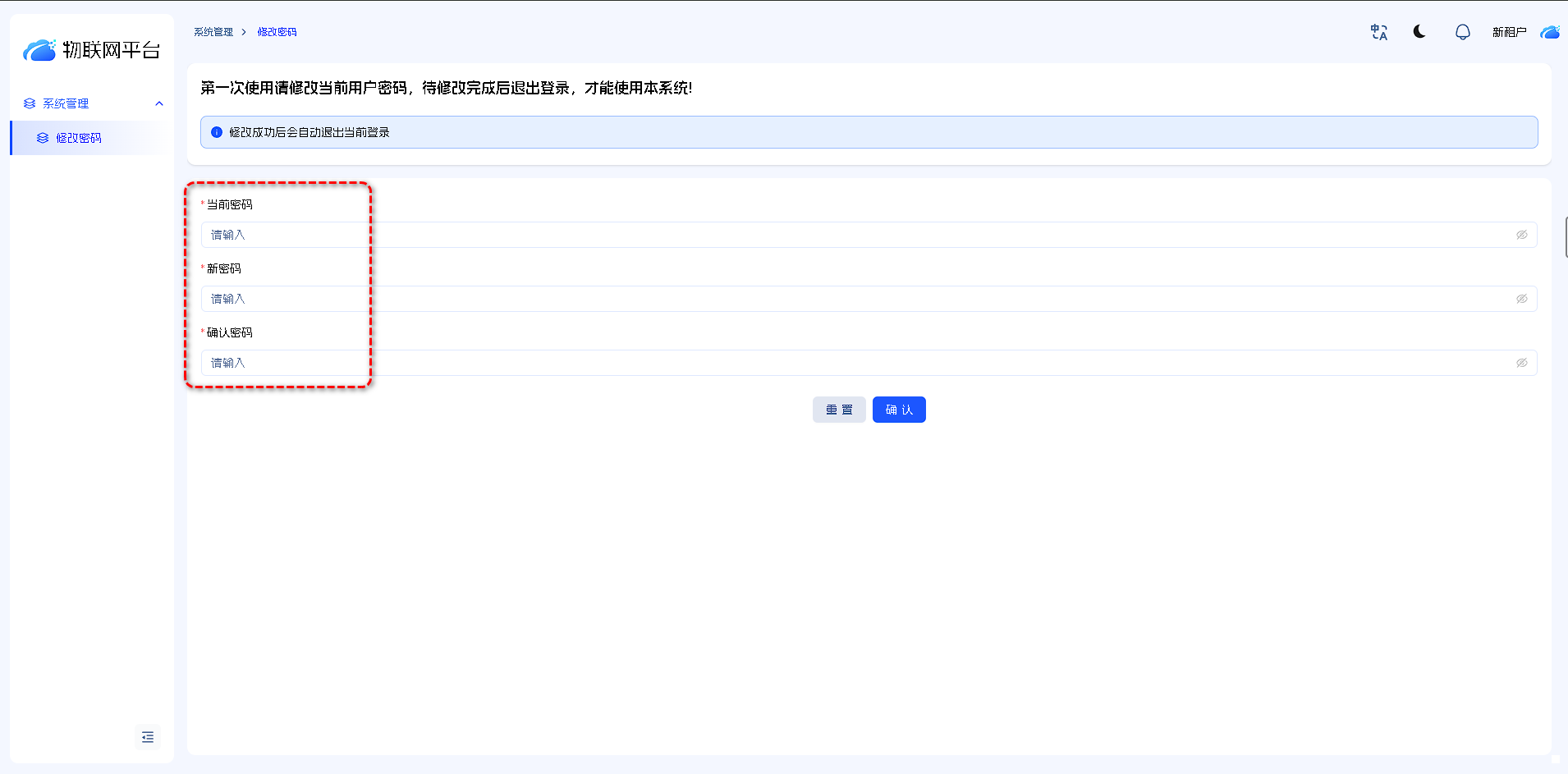 新账号可直接在租户界面点击进入,则直接登录用户账号,刚创建登录账号会跳转为修改密码界面。默认密码为123456(如果新增时设置了密码则为设置的密码),修改之后,再从租户点击进入就直接登录此账号了。