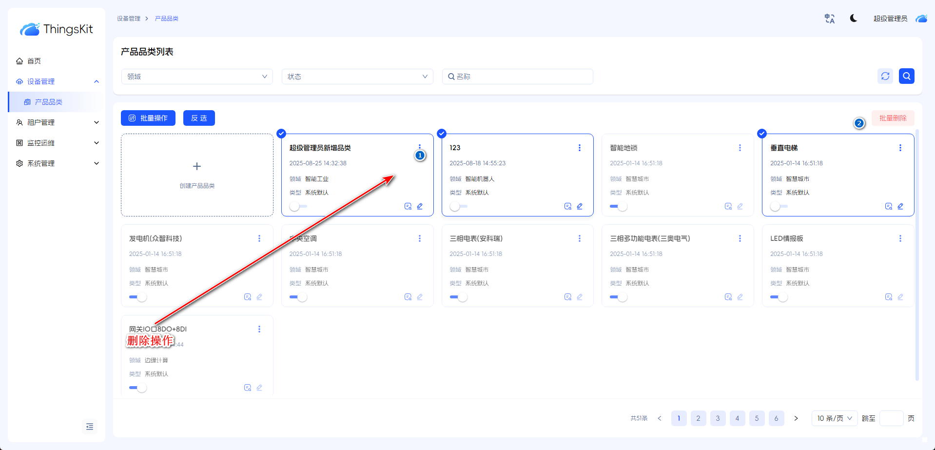 选择品类进行删除,或选择多个进行批量删除。
