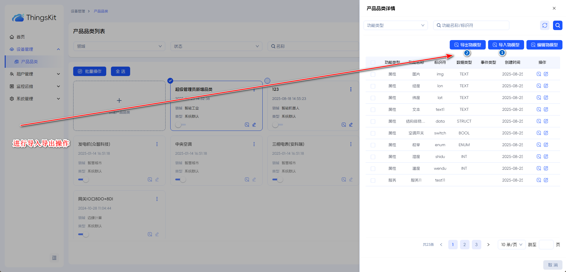 点击产品品类详情,对物模型进行新增,导入和导出功能的操作。