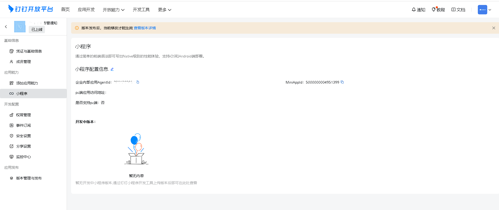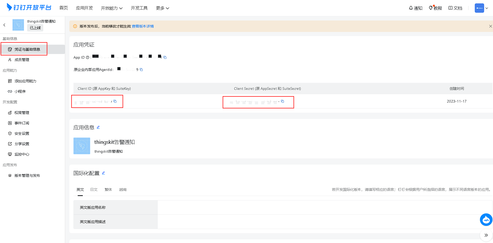 6.最后复制AgentId,凭证与基础信息里面复制clientID和clientSecret。