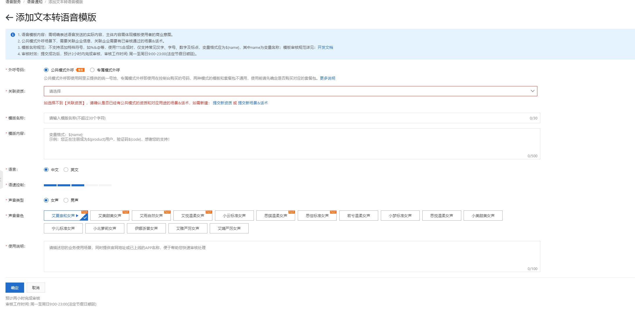 4.根据所买套餐创建相应模板等待审批通过(账号无关联资质的需提交资质并等待阿里云审批通过后创建)