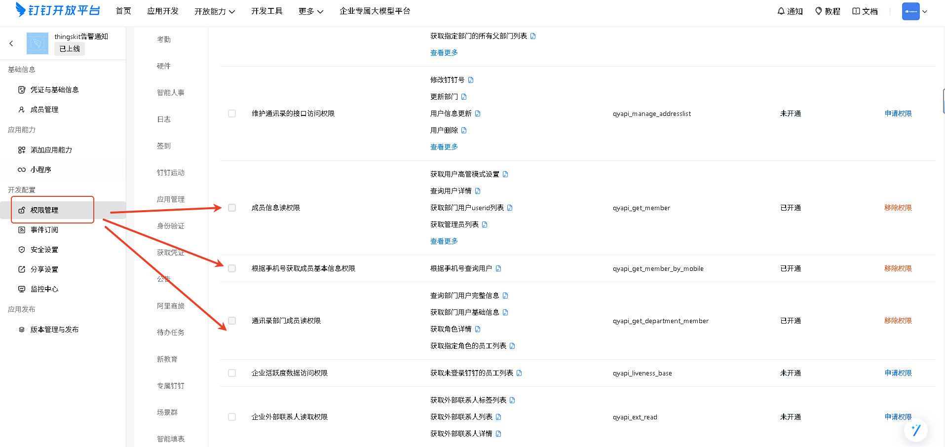 7,在钉钉权限管理中,将这三个权限进行申请权限即可。