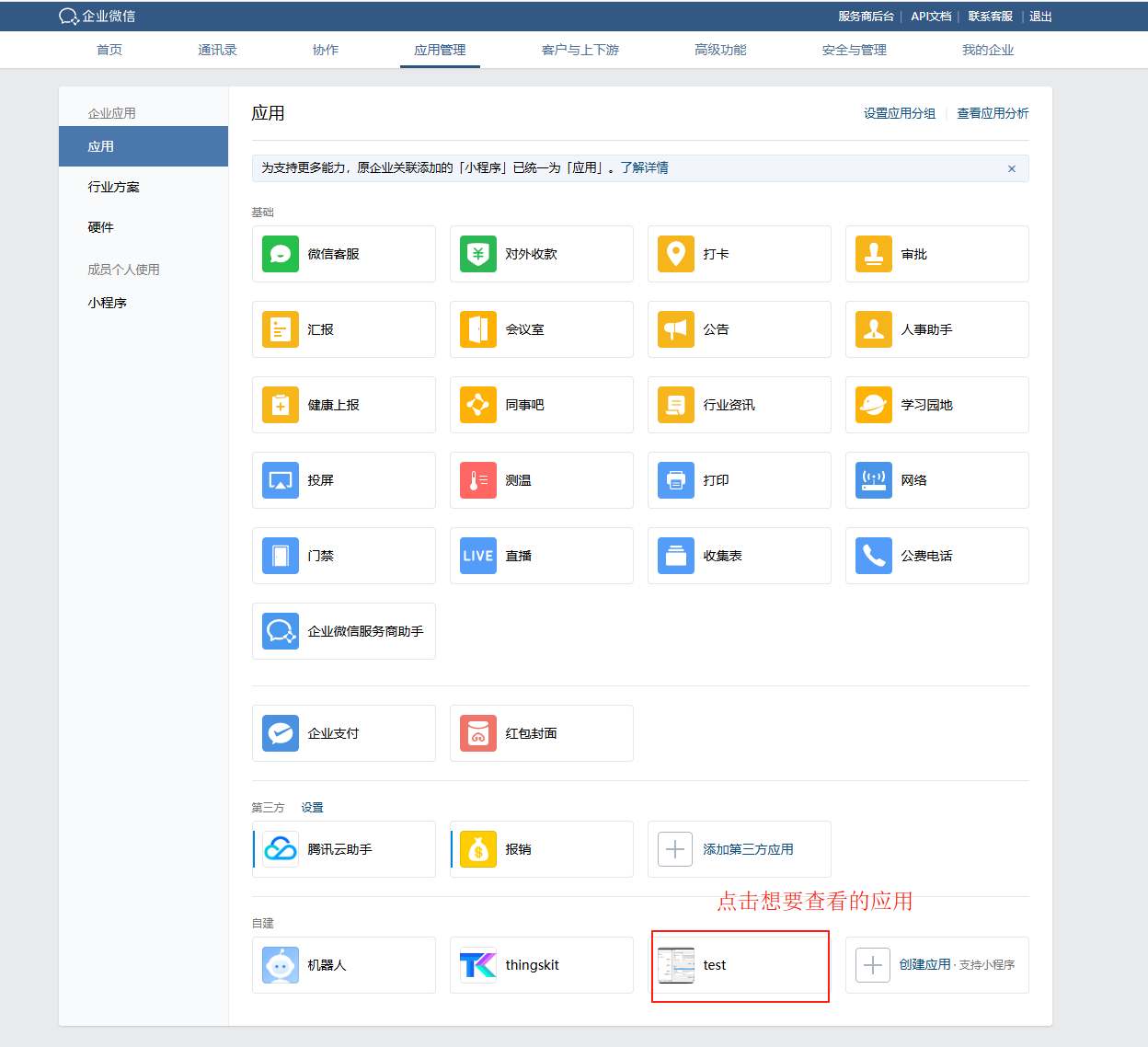 查看Secret需通过企业微信查看,不能通过WEB页面查看。点击“应用管理”,然后点击想要查看的应用。