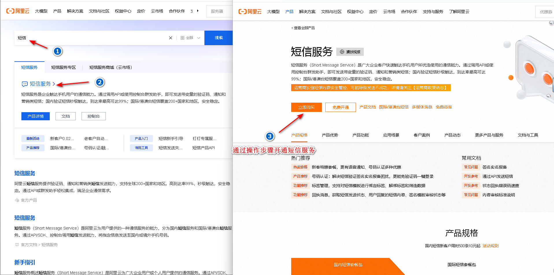 2.搜索短信服务,点击产品详情页。