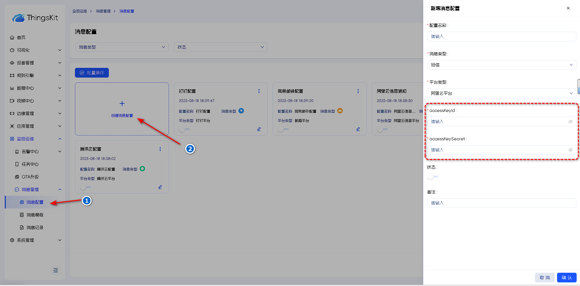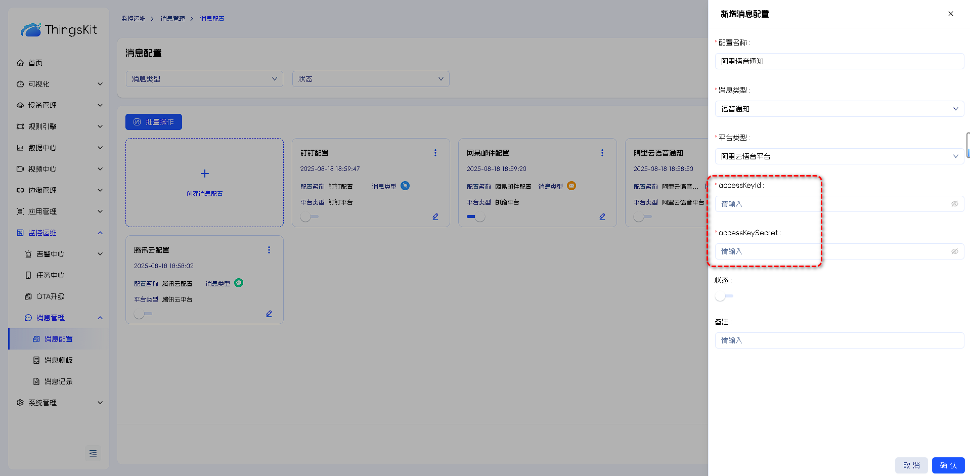 6.最后在平台消息配置里面,选择电话,将对应的accessKeyId,accessKeySecret和模板编号复制填入,专属模式则需要填入申请的专属号码,启用后在消息模板选择该配置并选择用途即可使用