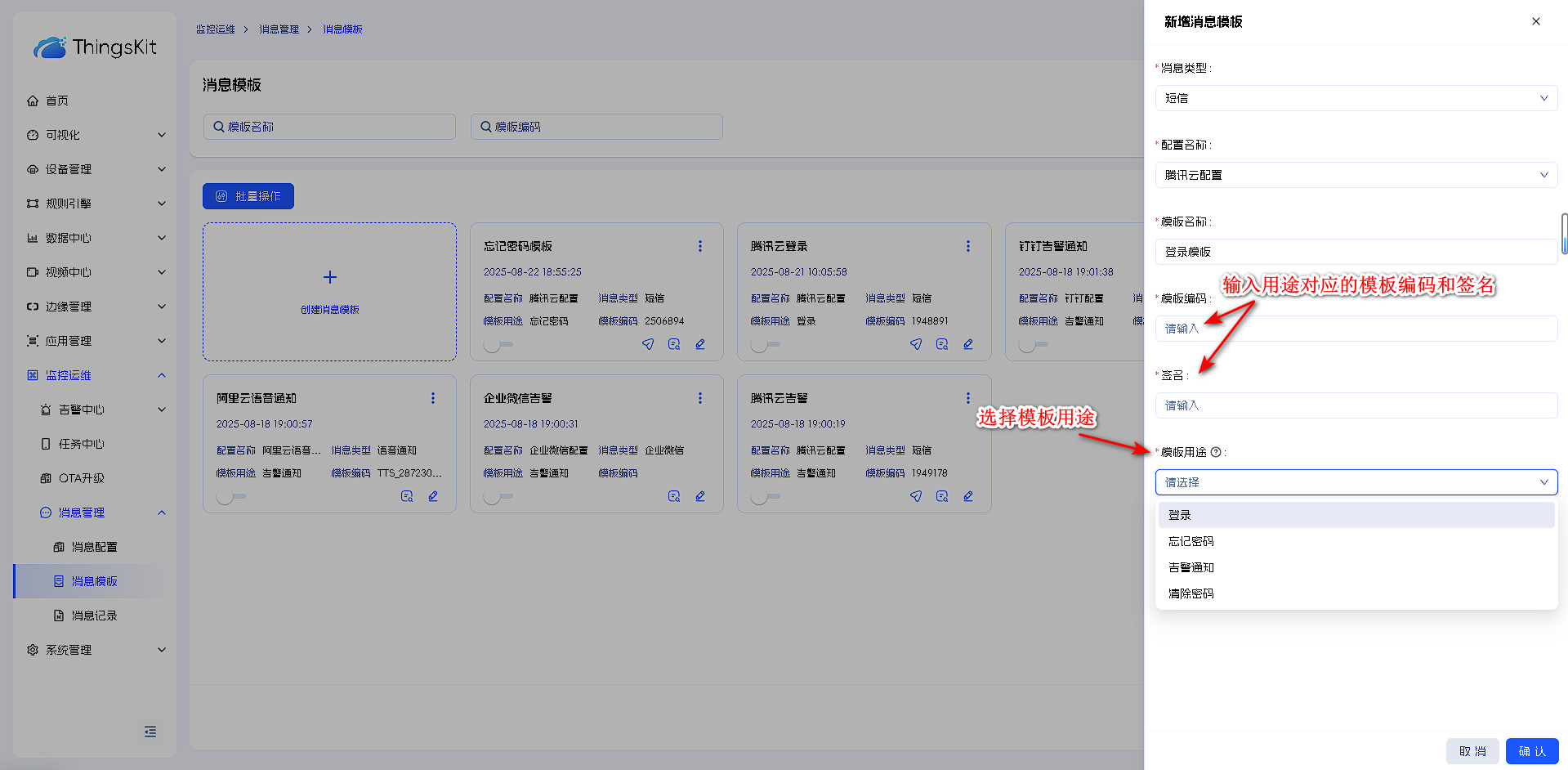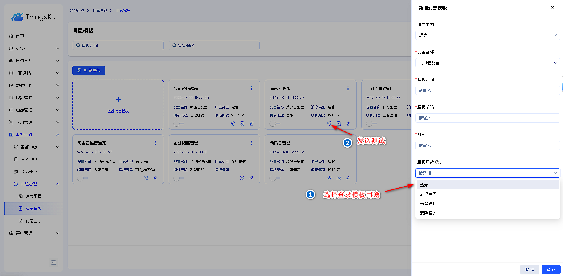 6.短信模板选择对应配置,发送只有登录用途才能测试(消息配置和消息模板需启用)。