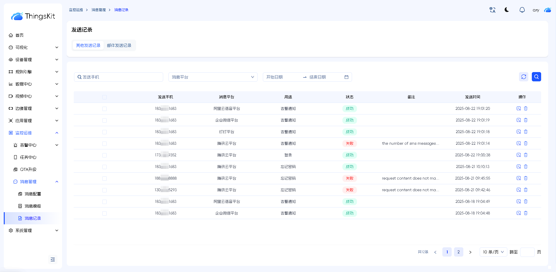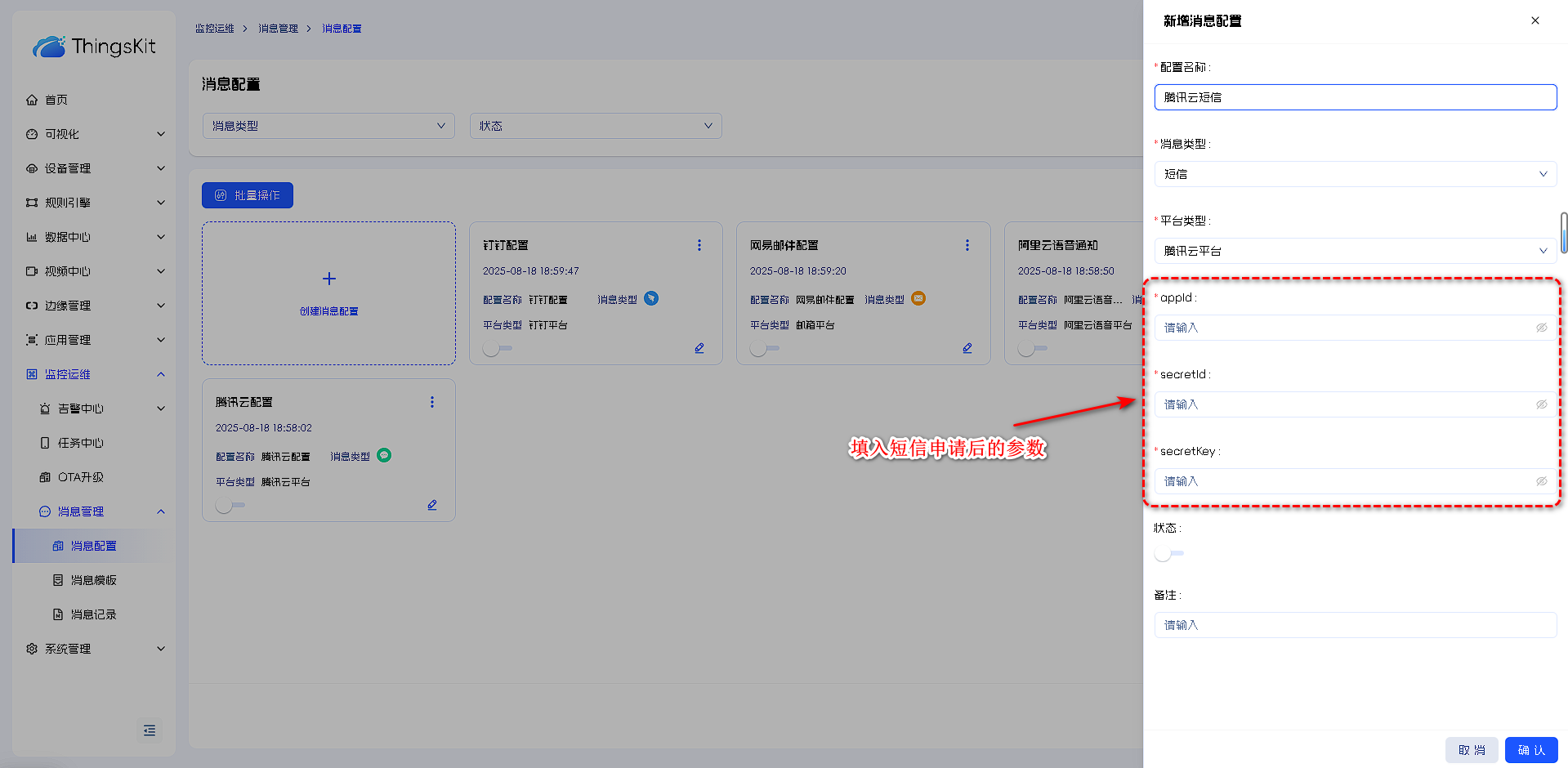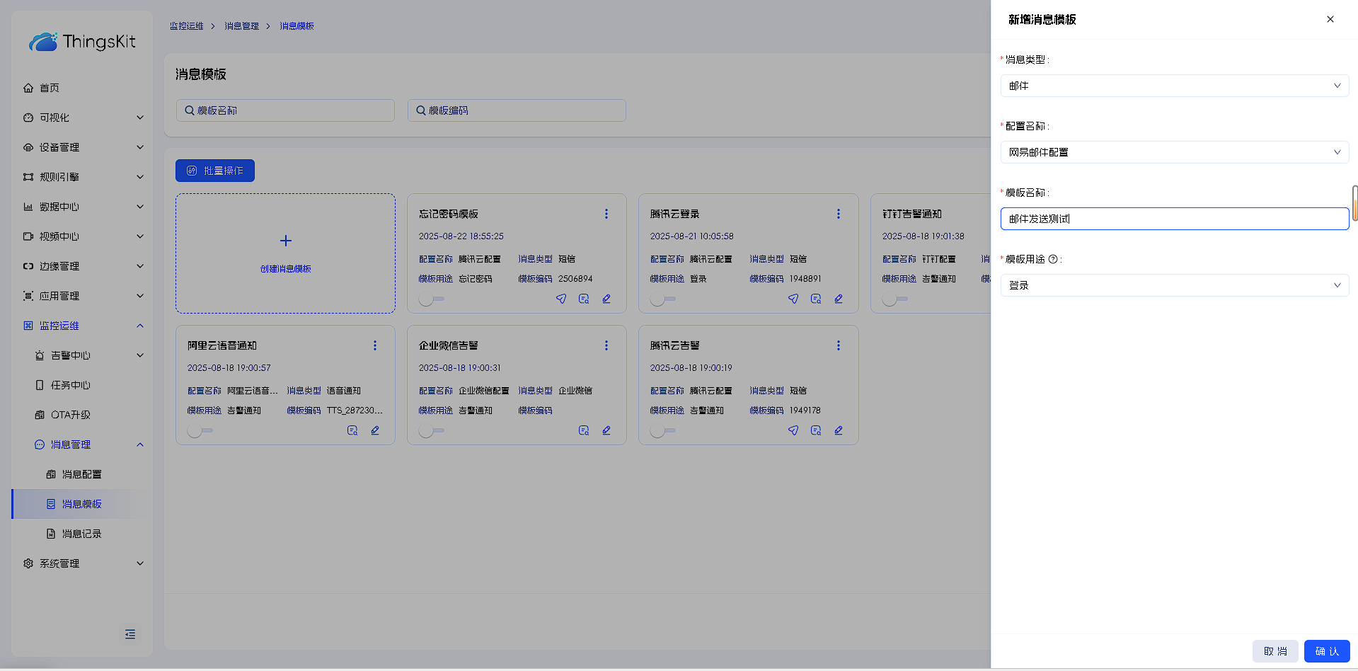 5.短信消息模板的配置:选择对应的消息配置,填入短信平台相关信息,启用后点击发送按钮可进行测试(模板用途为告警通知时不可发送测试,传入参数不一致)。发送记录可在消息记录里面进行查看。