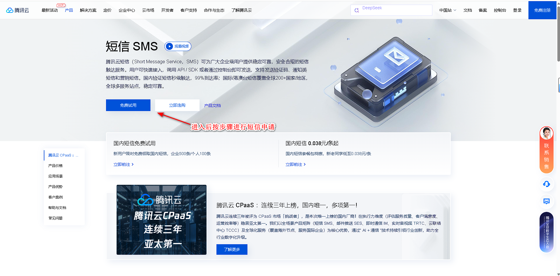 3.查看产品流程,按照新手指引进行操作,完成后可免费开通,进行免费测试短信。