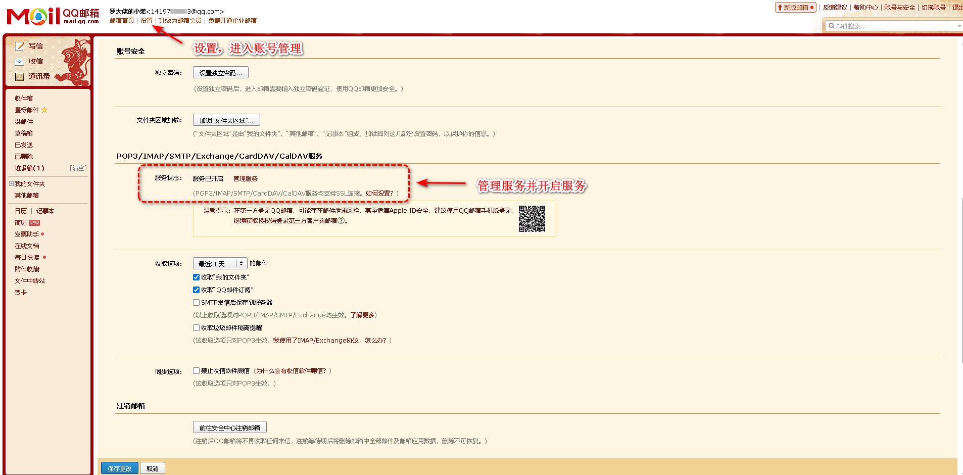 2.点击左上角设置功能,选择账号栏往下拉会有POP3/IMAP/SMTP等服务。