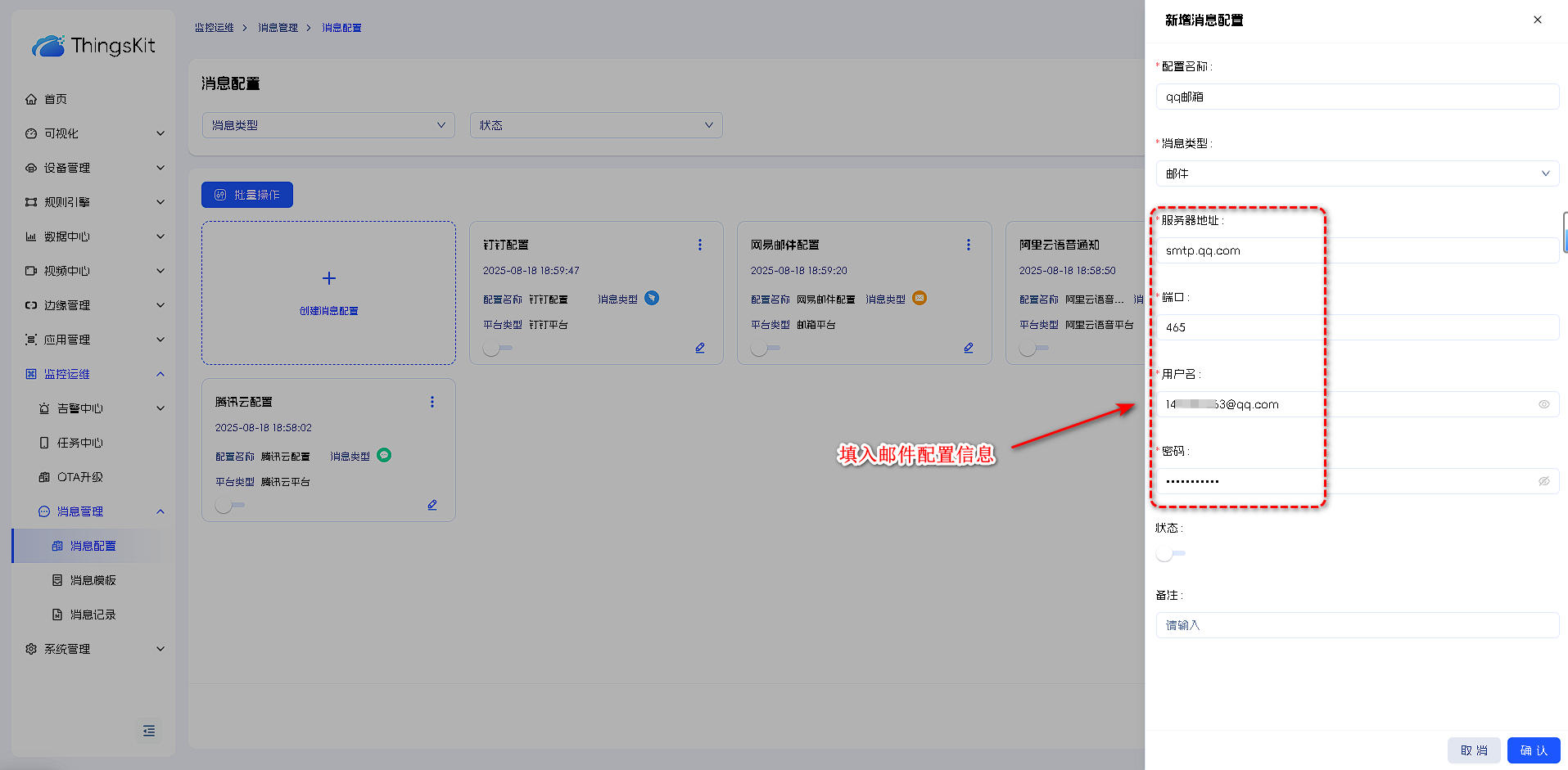 4.消息配置中选择邮件,填入邮件开通后的相关信息,选择启用。