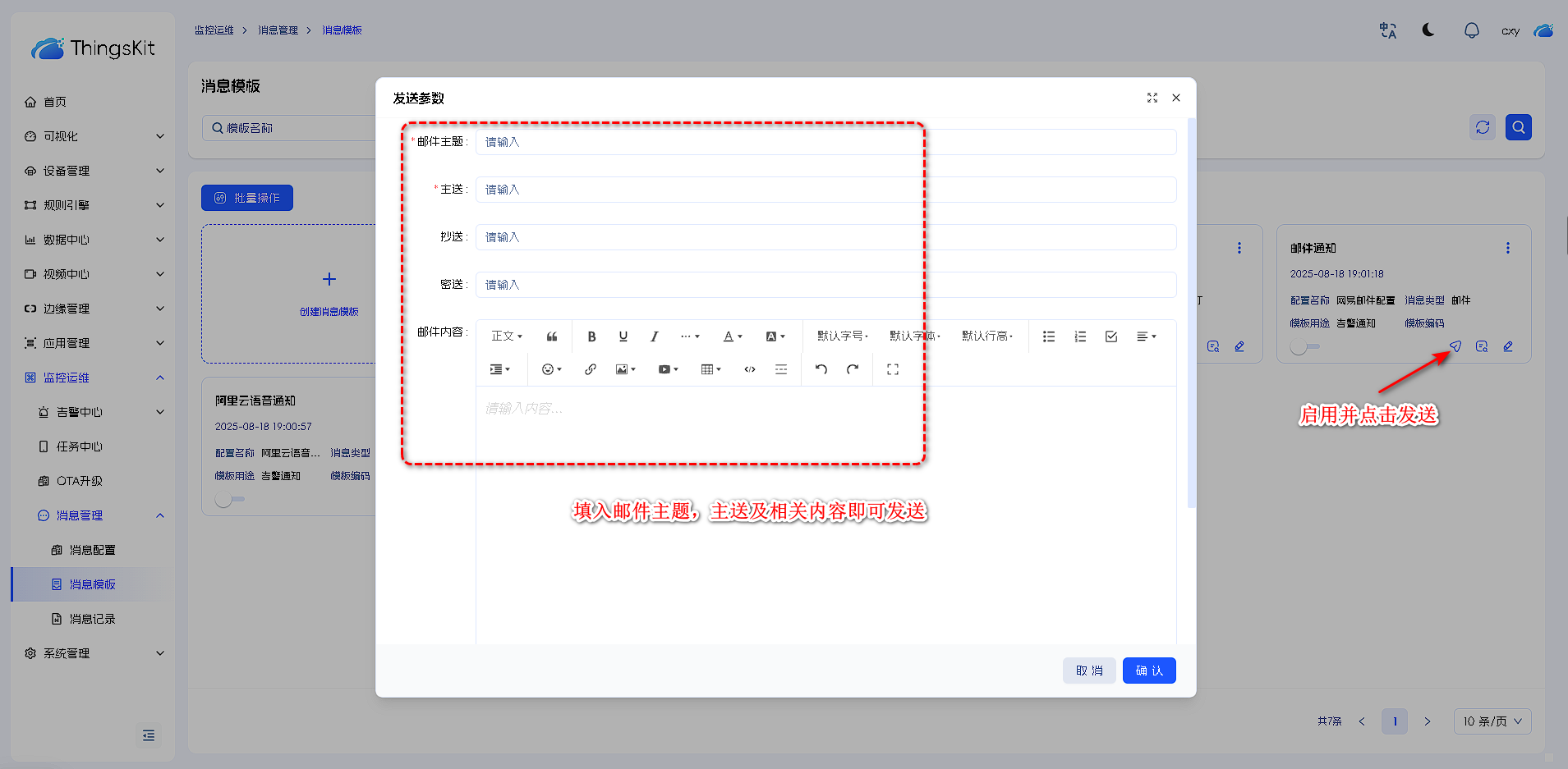 5.消息模板中,选择邮件消息配置并启用的,新增并启用,点击发送进行邮件测试是否成功。
