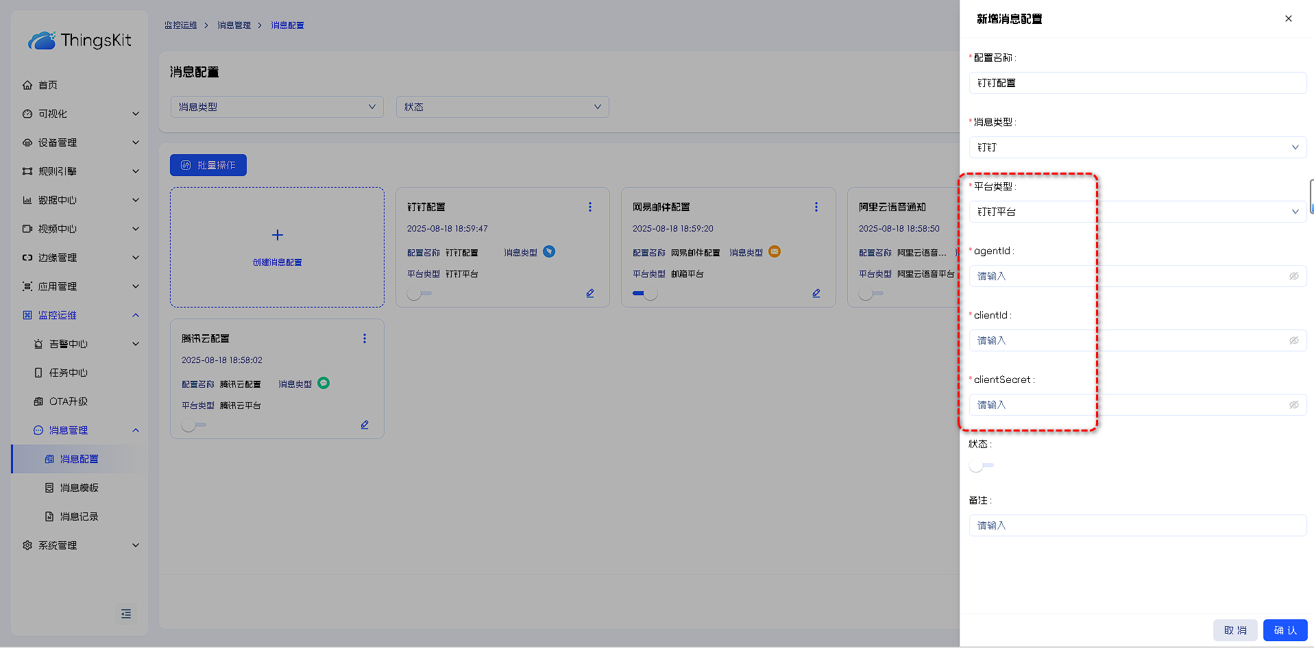 8,最后在平台消息配置里面,选择钉钉,将AgentId,clientID和clientSecret复制填入,启用后在消息模板选择该配置并选择用途即可使用。