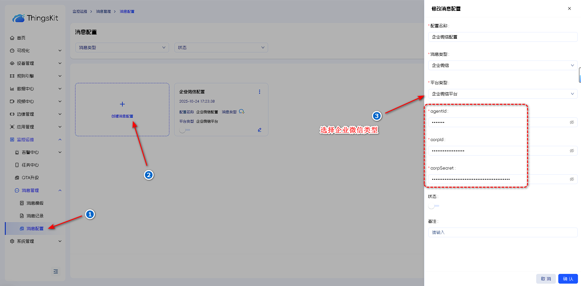 3.登录平台租户管理员账号,消息配置中选择企业微信,将上述相关参数对照填入。