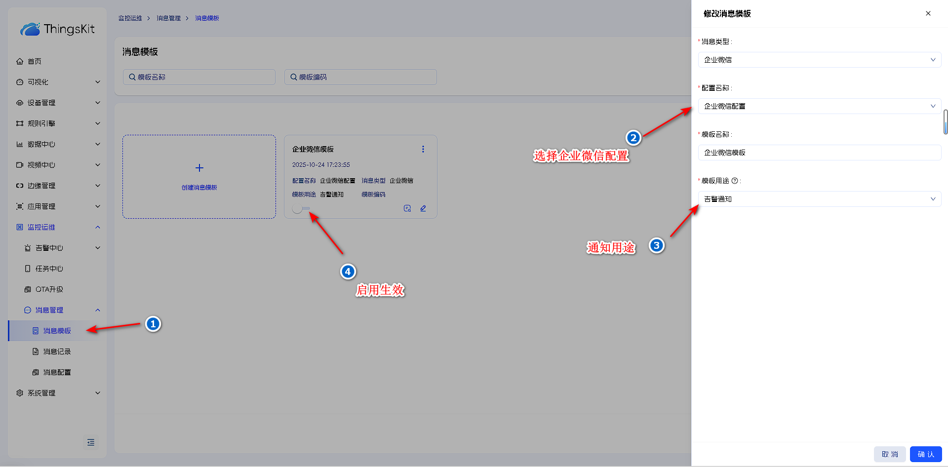 4.创建好消息配置后并启用,在消息模板中选择企业微信配置及模板用途。