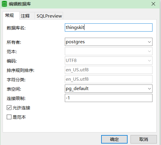 -- WITH OWNER "postgres" ENCODING 'UTF8' LC_COLLATE = 'en_US.UTF-8' LC_CTYPE = 'en_US.UTF-8' TEMPLATE template0;执行命令后生成数据库信息如下图: