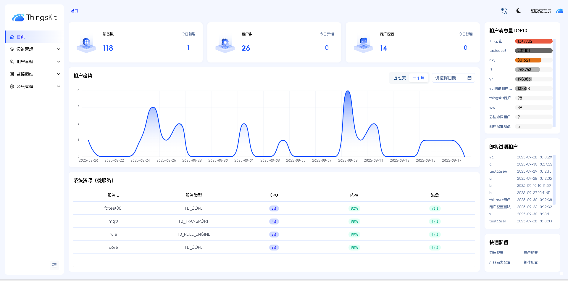 最高权限账号:界面展示所有设备数,租户数及租户趋势统计图,租户配置,租户消息量TOP10,即将过期的租户,快捷入口,系统资源。