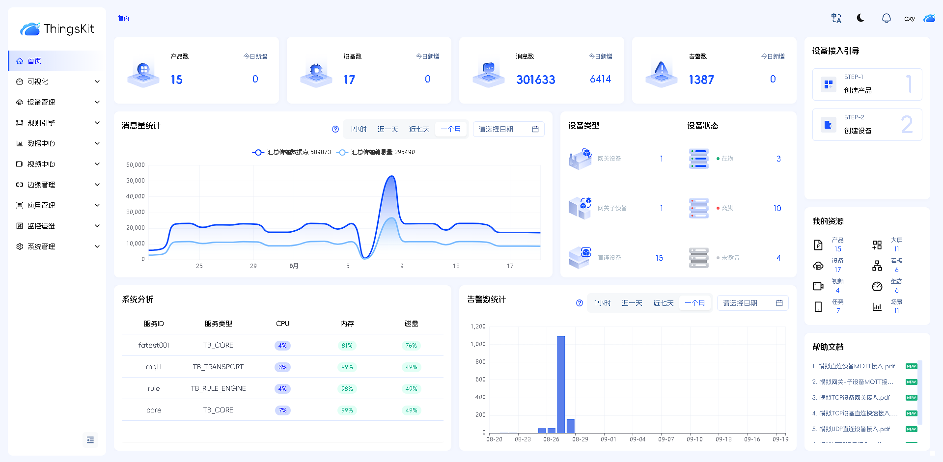 首页展示该租户管理员的设备信息,类型,状态,产品信息,消息量及趋势图,快捷入口,告警数据,系统分析和文档入口。