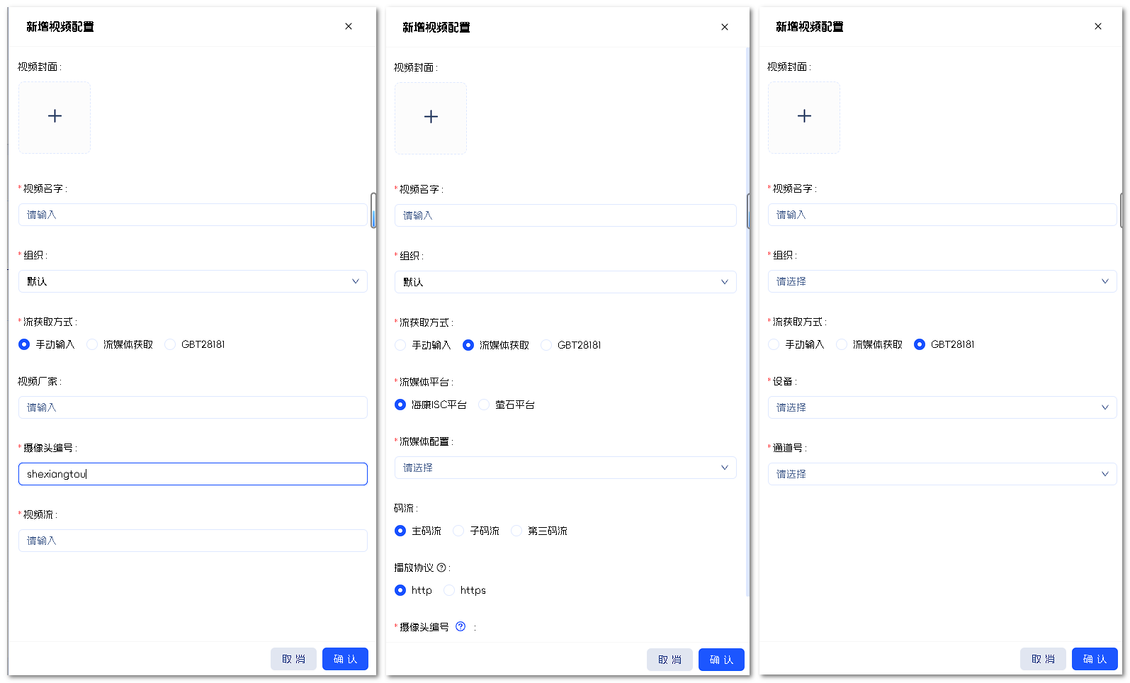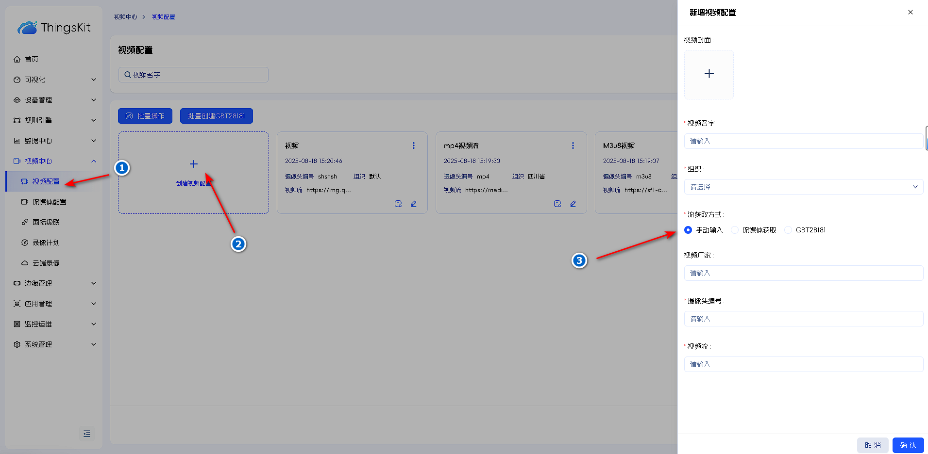 视频配置分三种类型:手动输入,流媒体配置,GBT28181。对应自己需要进行添加。
