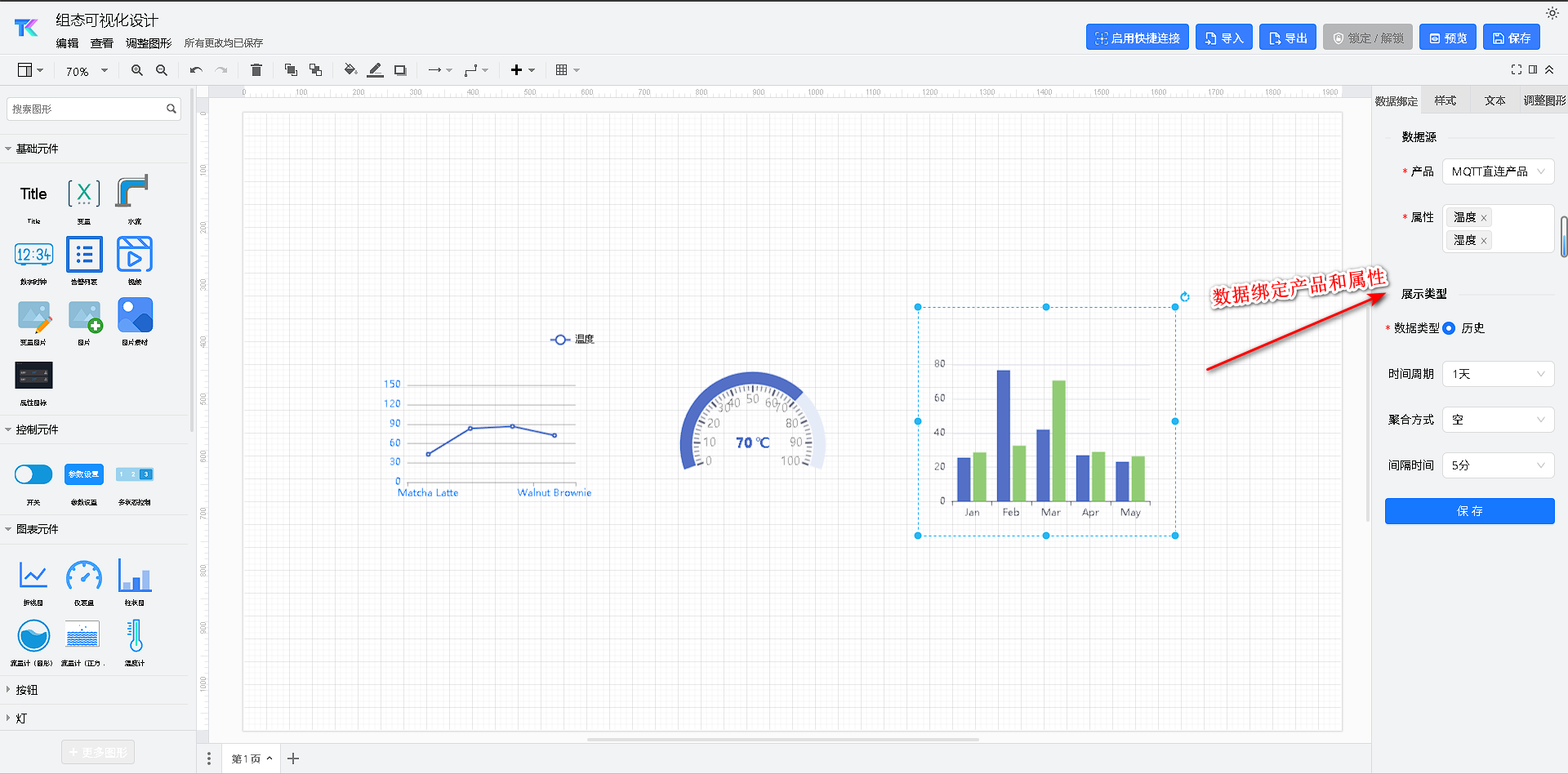 模板中组件绑定为产品和属性,组态新增选择设备后,会使用为该产品下第一个设备的属性。
