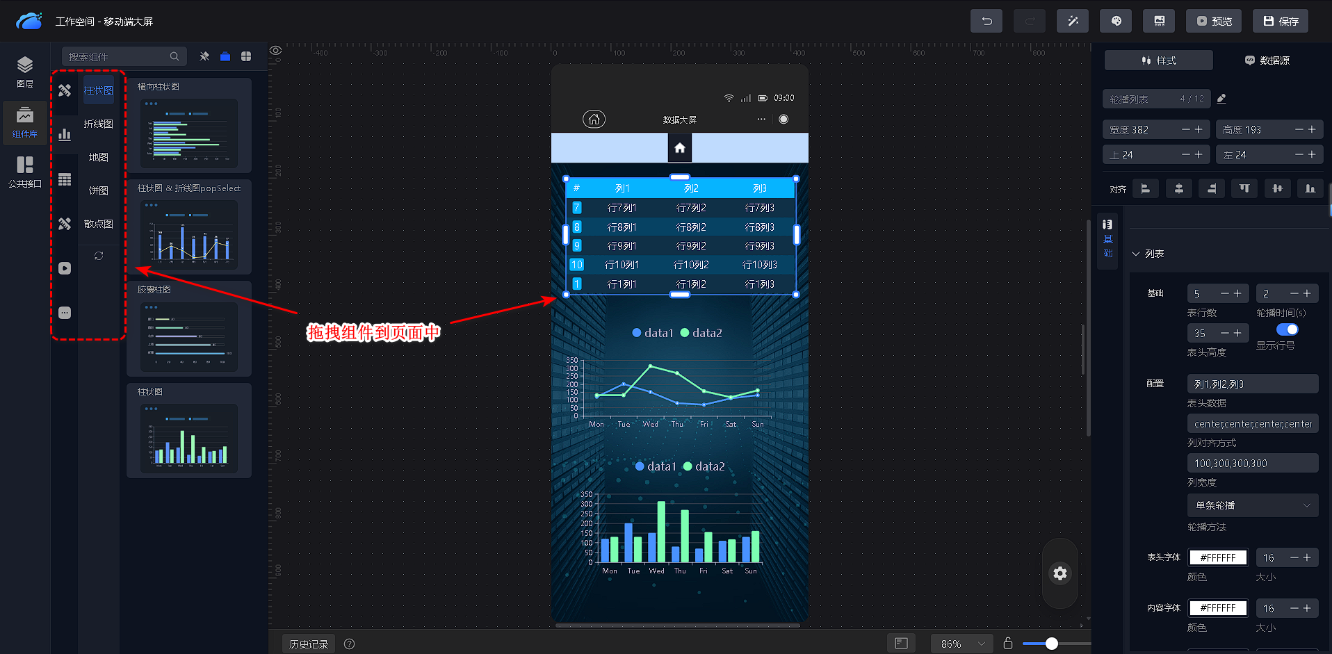 点击看板设计按钮,进入设计界面,拖拽大屏组件进行设计,设计好后点击保存并预览,因为是移动端展示,所以在PC预览因为分辨率原因导致不美观。