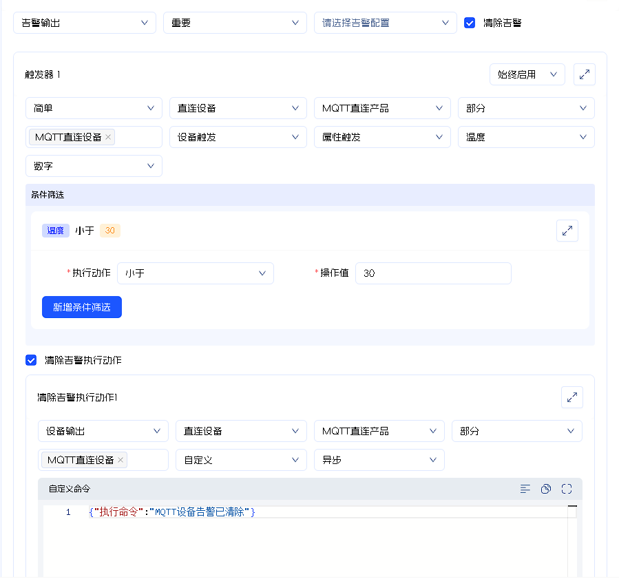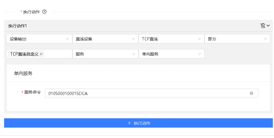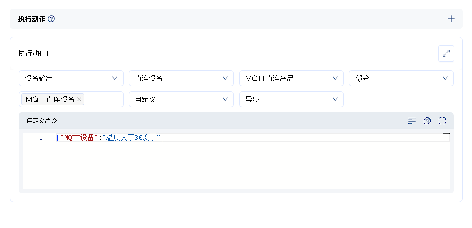 自定义执行动作,设备为MQTT设备下发为json数据格式,TCP设备下发为自定义命令。