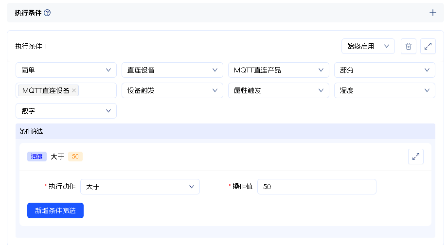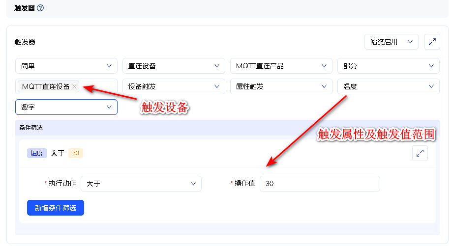 通过选择产品,设备和所创建的物模型属性,满足触发该属性所定义的范围即可触发,一个场景联动只能有一个触发器。