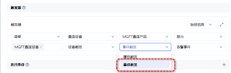 通过设备的物模型事件触发,事件触发操作事件管理(TCP类型设备没有事件触发)。