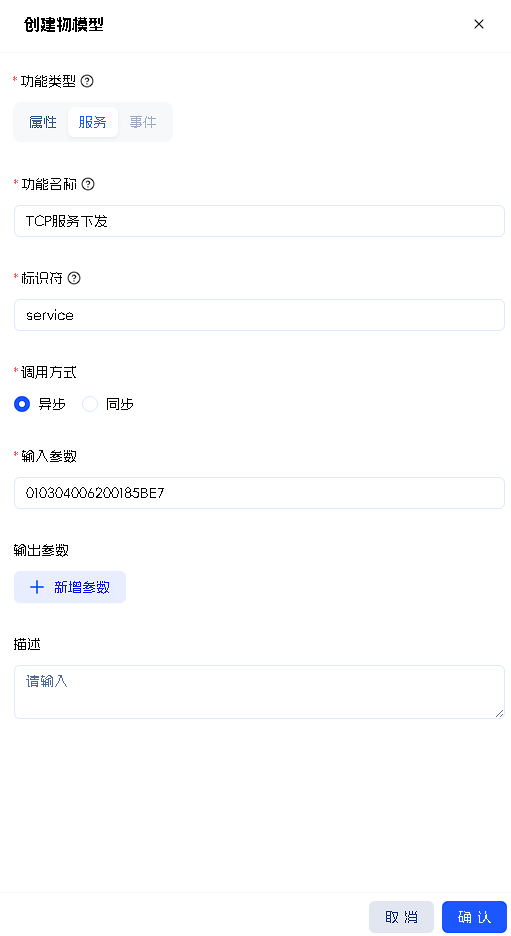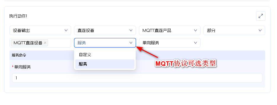 执行动作为服务时,下发属性参数。设备为MQTT设备下发为定义的数据格式,TCP设备下发为物模型中定义好的十六进制数据下发。(TCP为MODBUS_RTU类型的设备不可下发服务动作,TCP自定义类型可以下发服务动作)