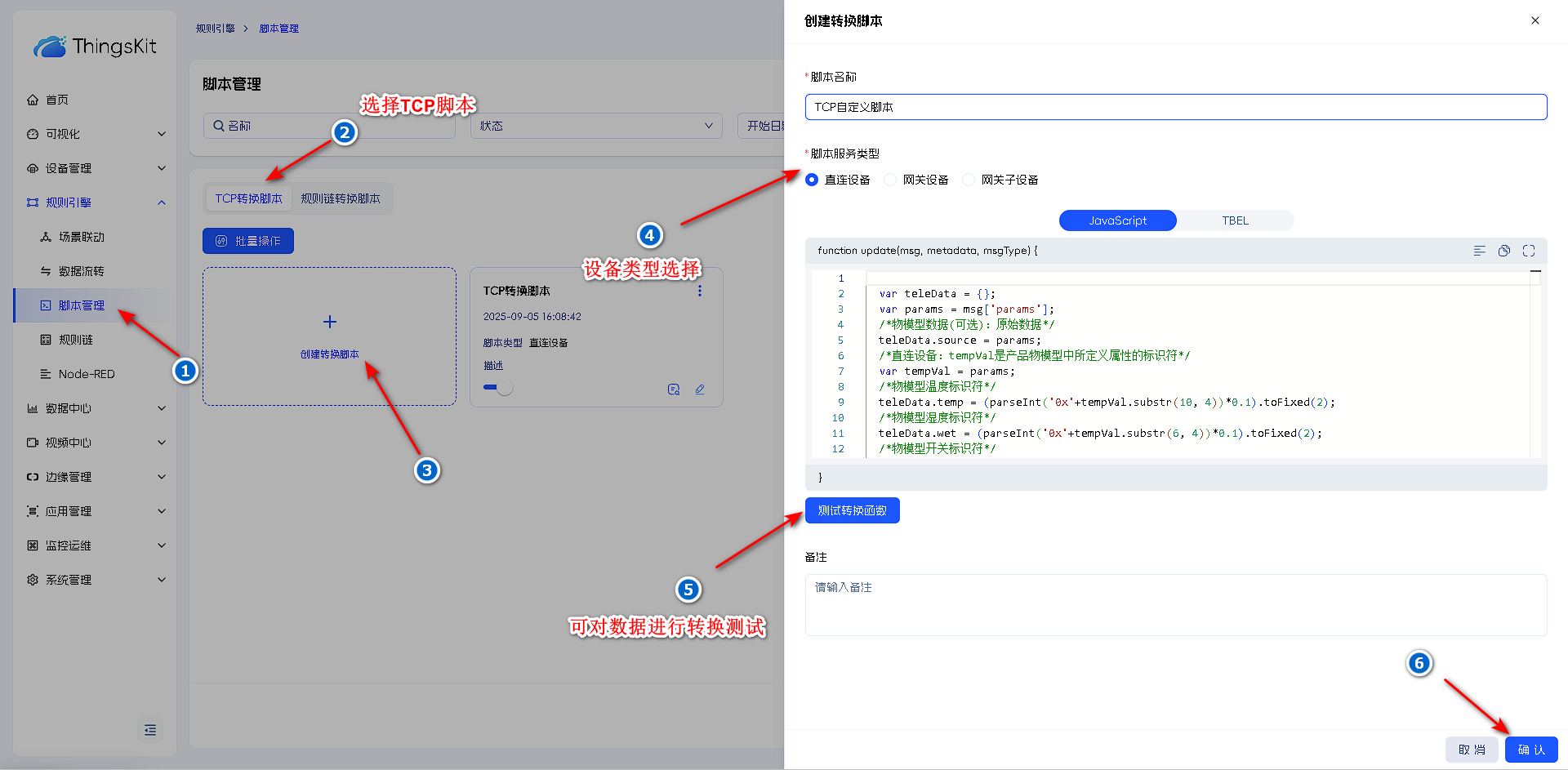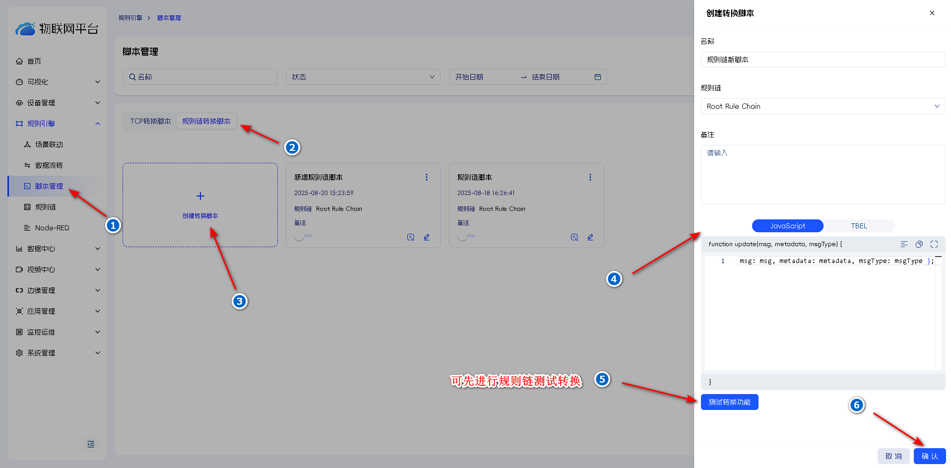 点击新增转换脚本,新增上行数据解析脚本和设备鉴权脚本。