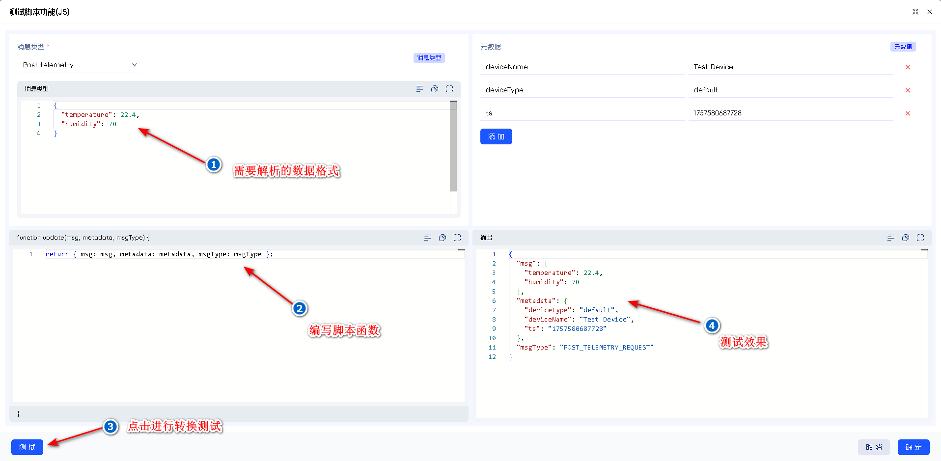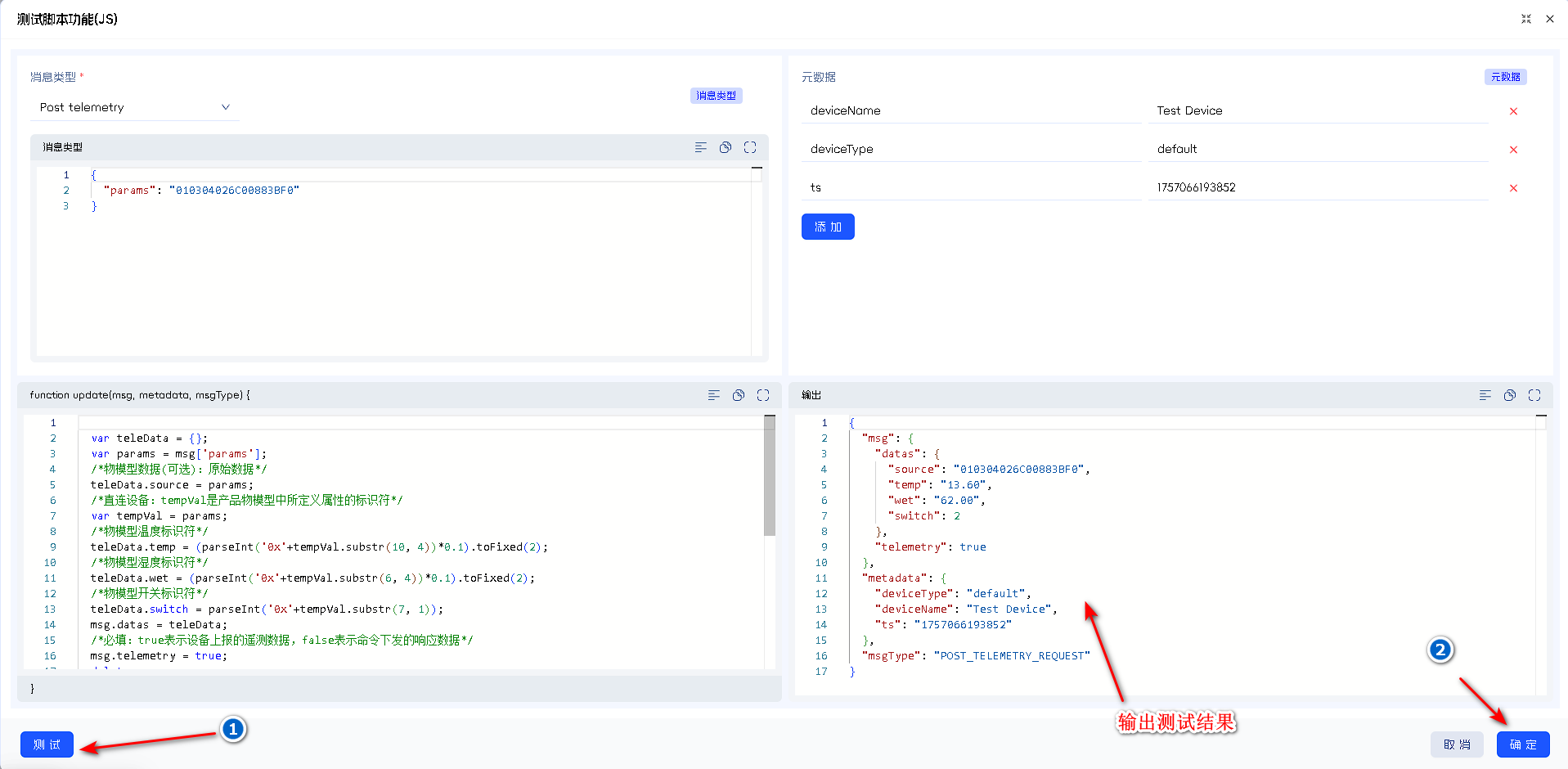 针对采用透传格式/自定义数据格式的设备,需要在云端编写数据解析脚本,将设备上报的二进制数据或自定义的JSON数据,转换为物联网平台支持的JSON数据格式。将平台下发的JSON格式数据,转换为设备支持的格式。