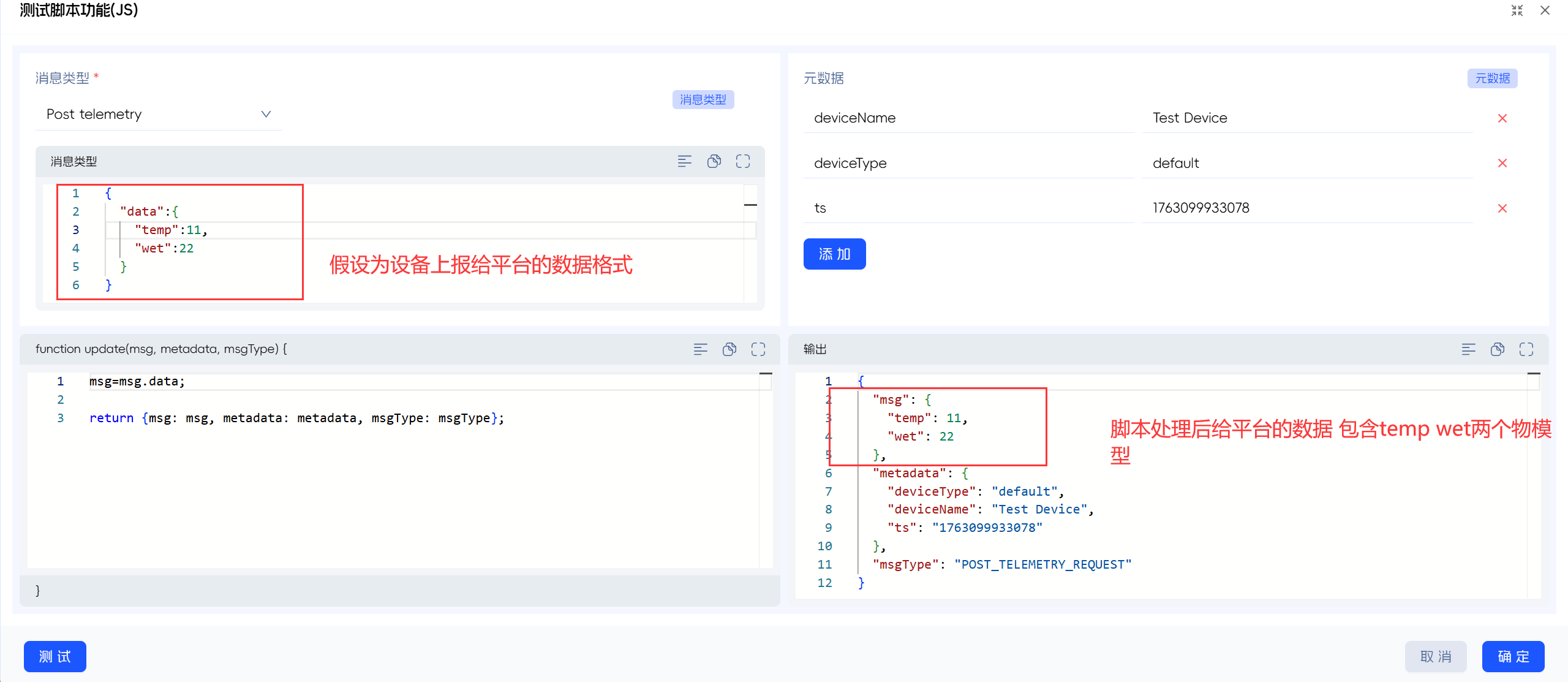 规则链转换脚本主要是将不符合平台上报格式(key/value)的数据通过脚本转换为平台支持的方式,如下图所示。