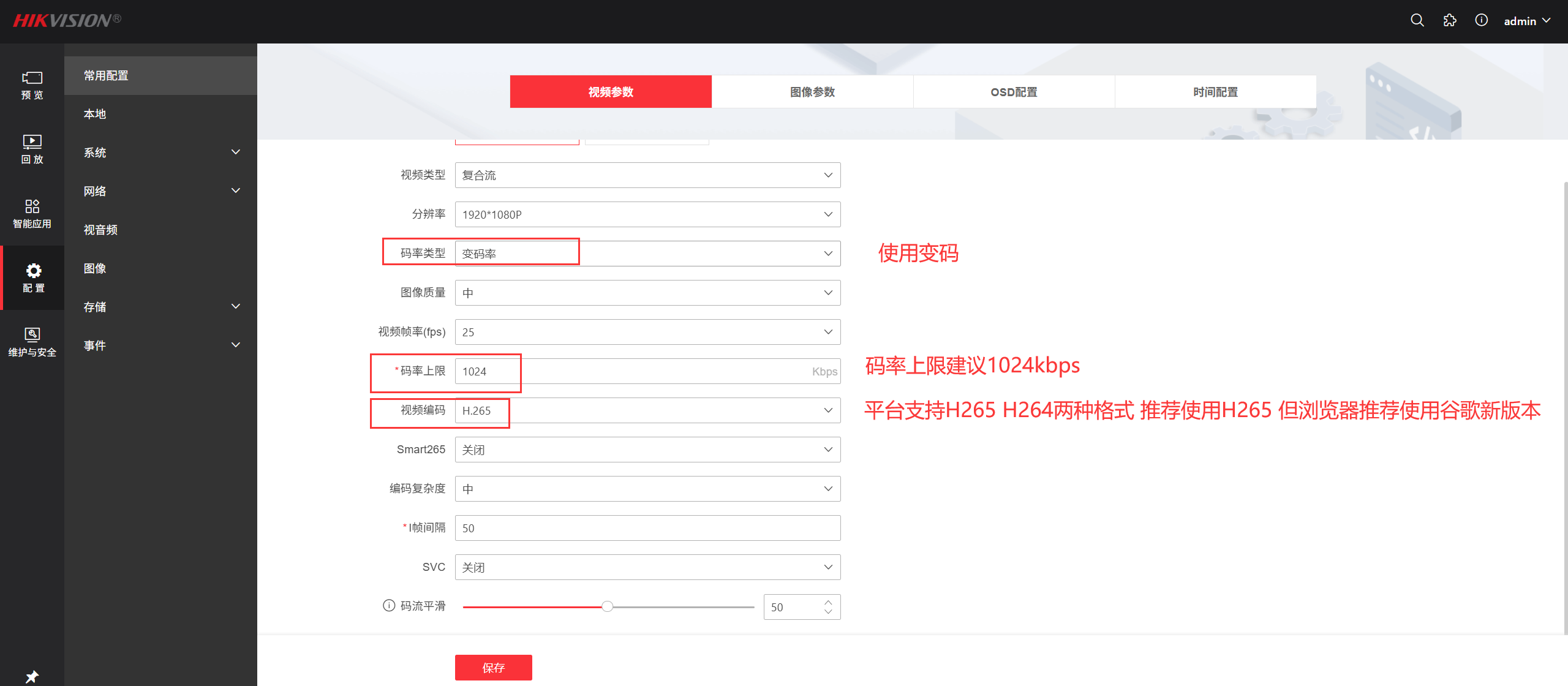 以下列海康摄像头为例,推荐几个比较重要的视频配置。视频编码若选择H256格式需要浏览器支持才能进行播放。