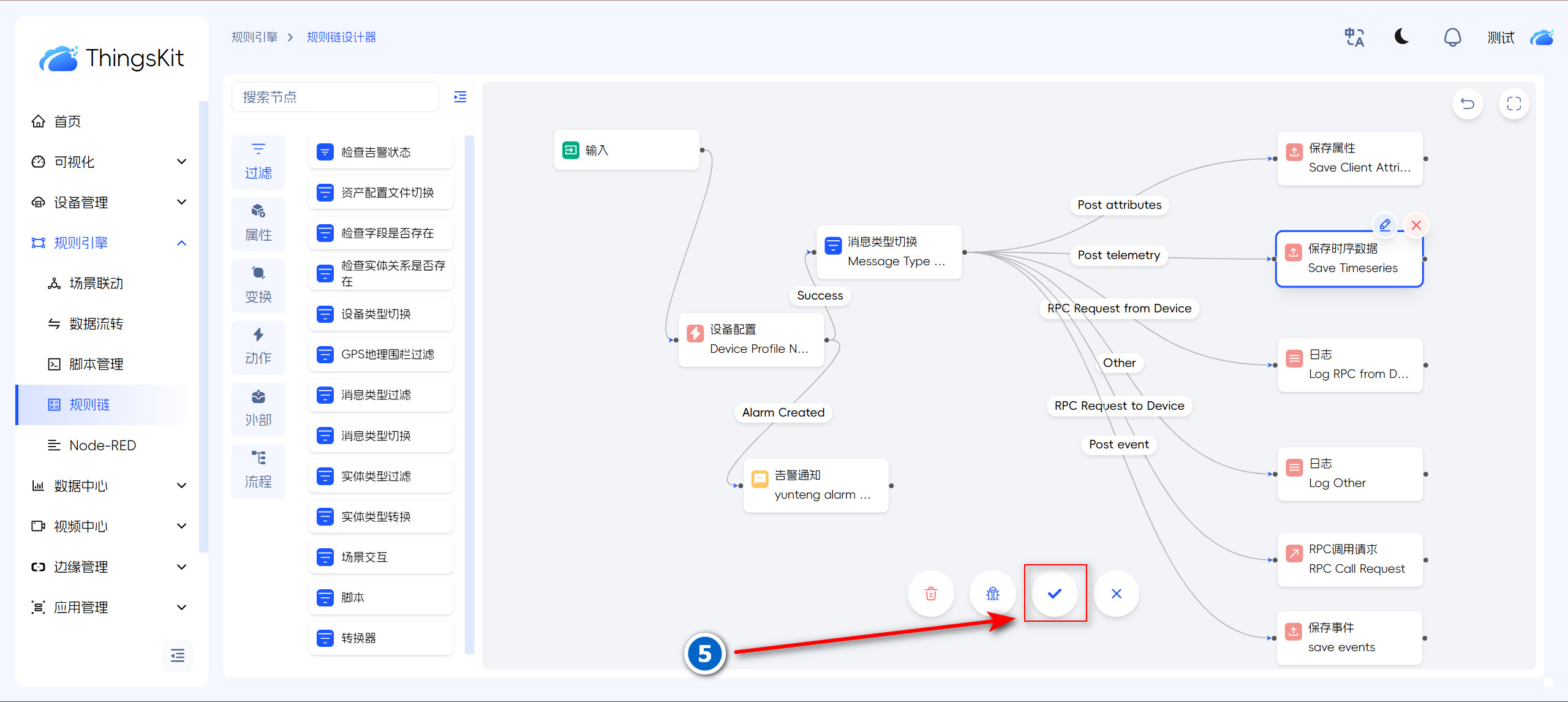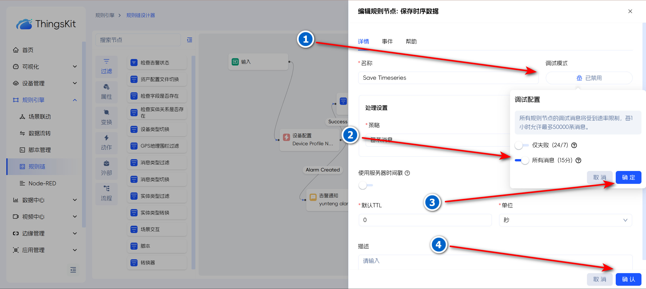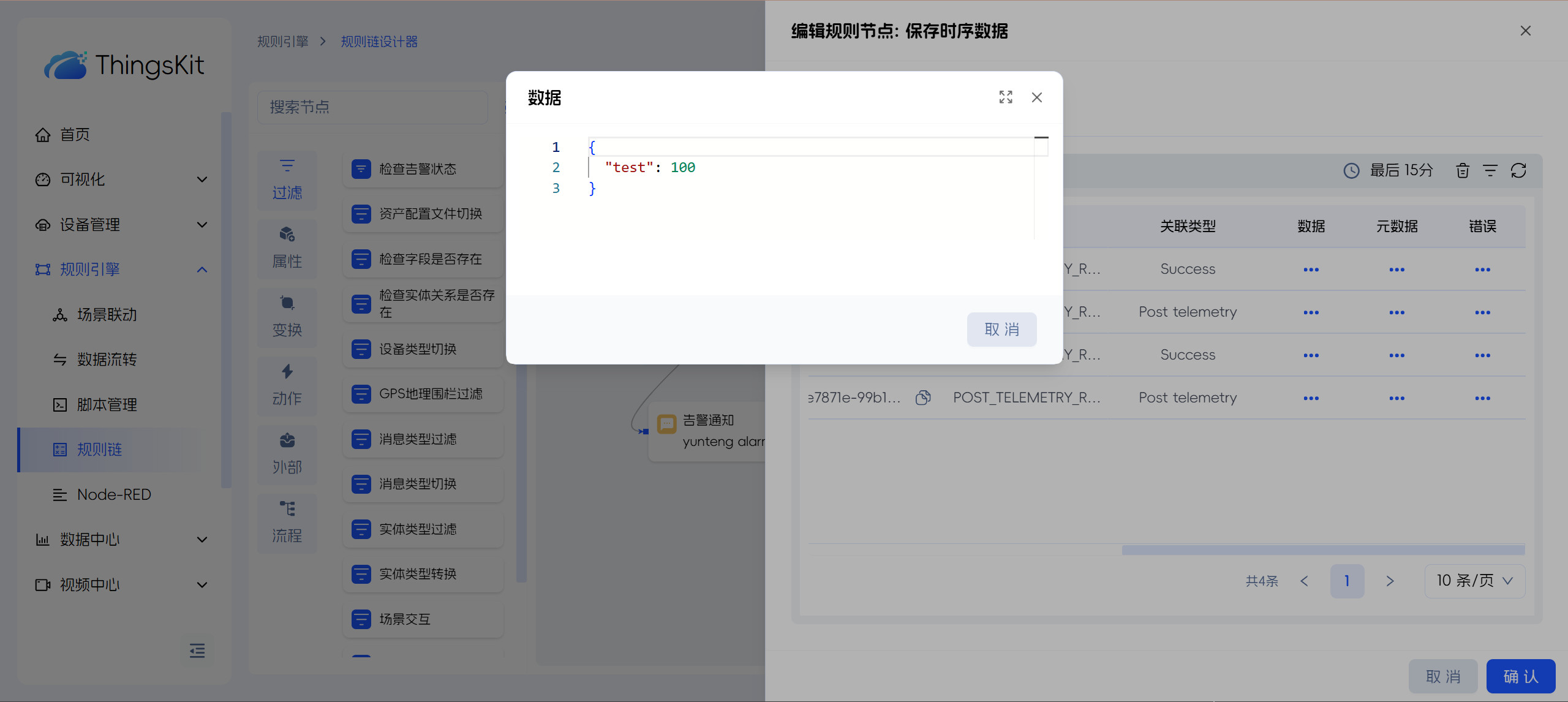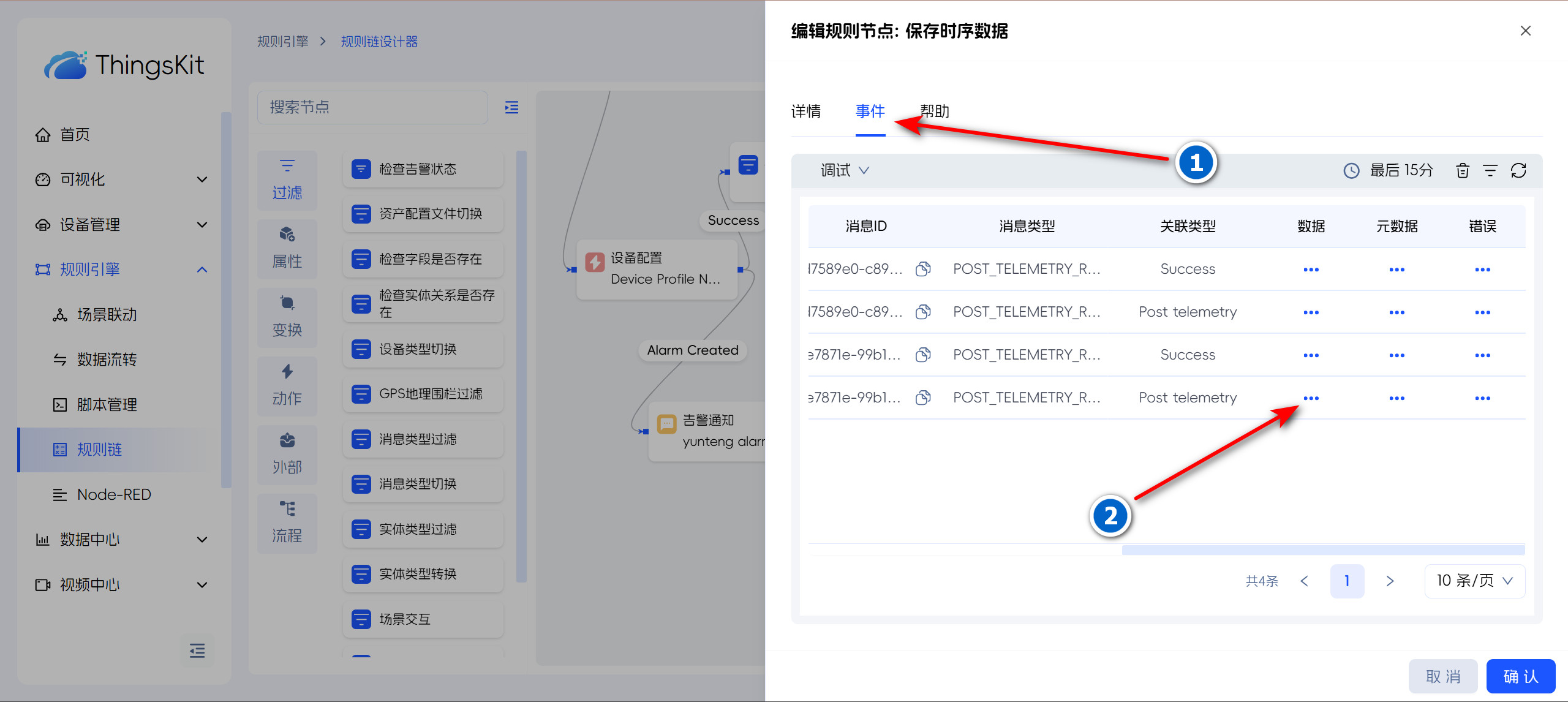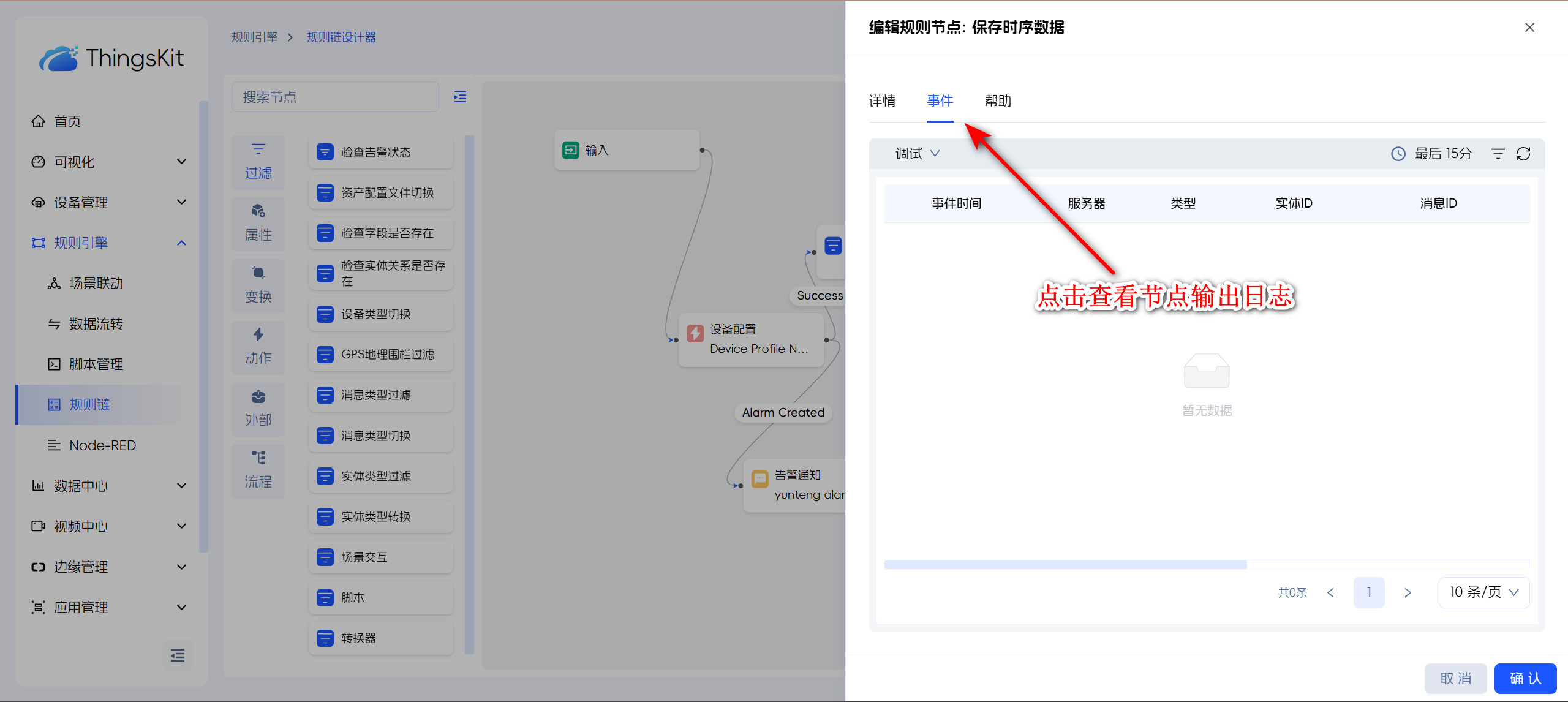 注意:如果要查看规则链里面消息传递的 输入 和 输出 需要在规则链里面开起debug模式,然后在对应节点的事件的调试中查看数据结果.