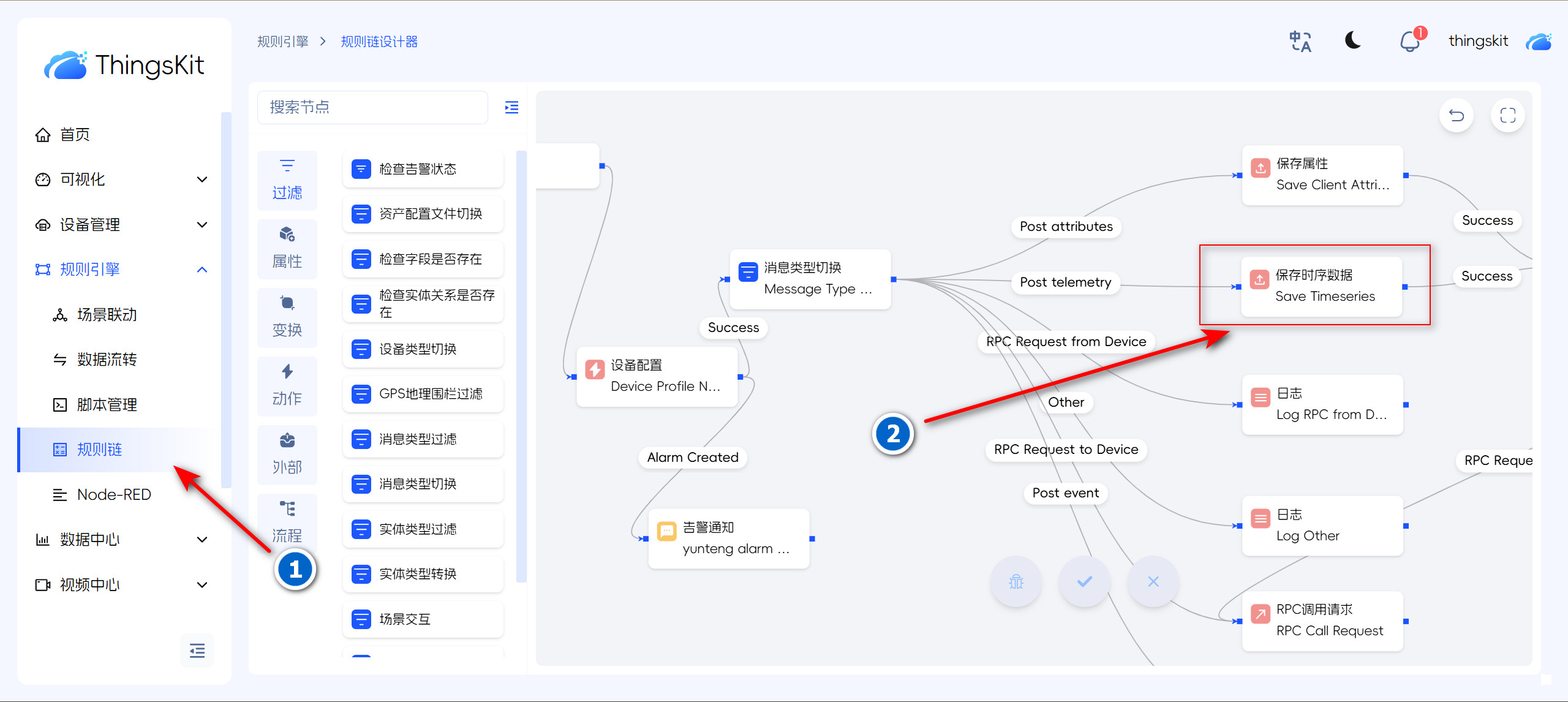 在规则链里面有保存时序数据节点可以直接显示上报的设备数据。