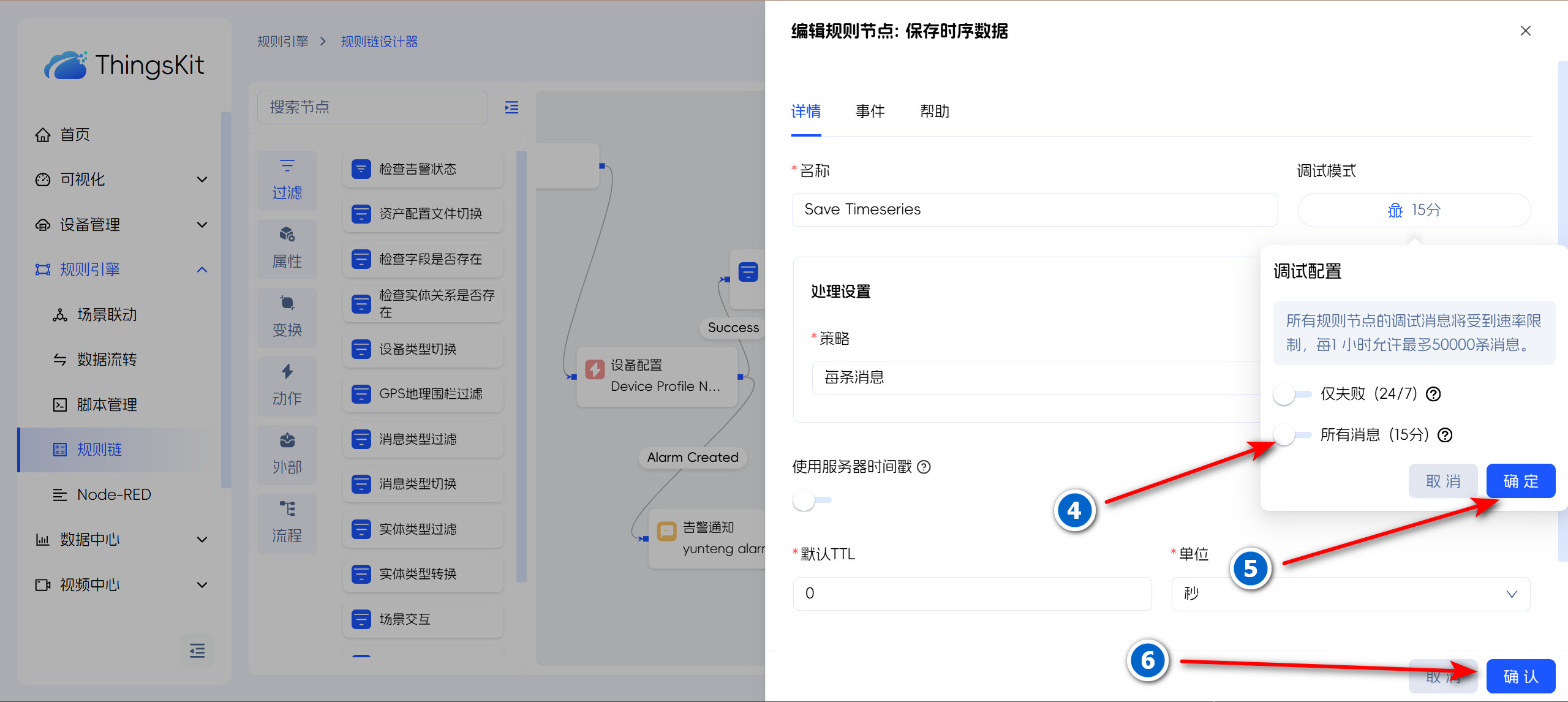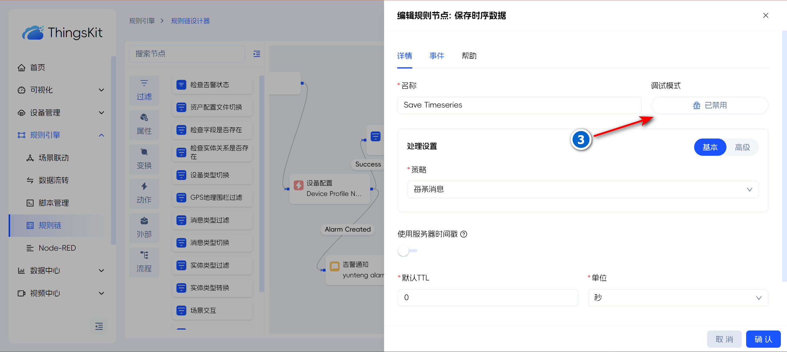 设置好节点的调试模式后,可以在保存时序数据节点的事件中查看上报数据。