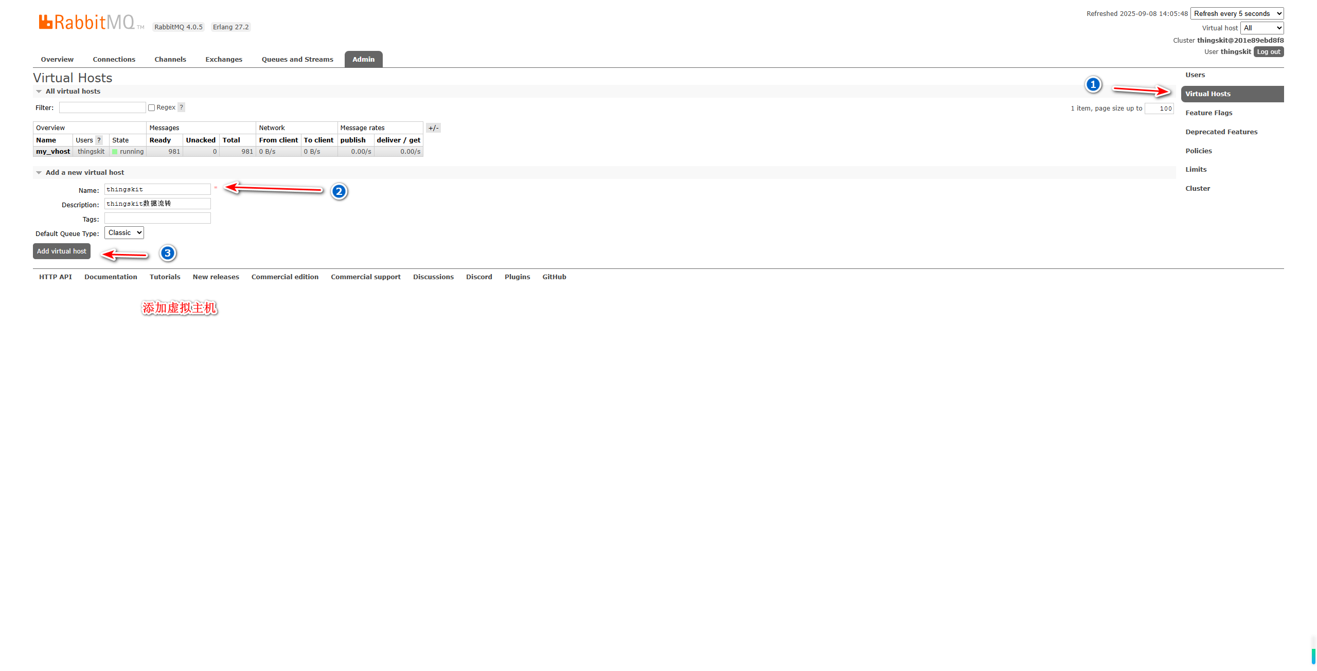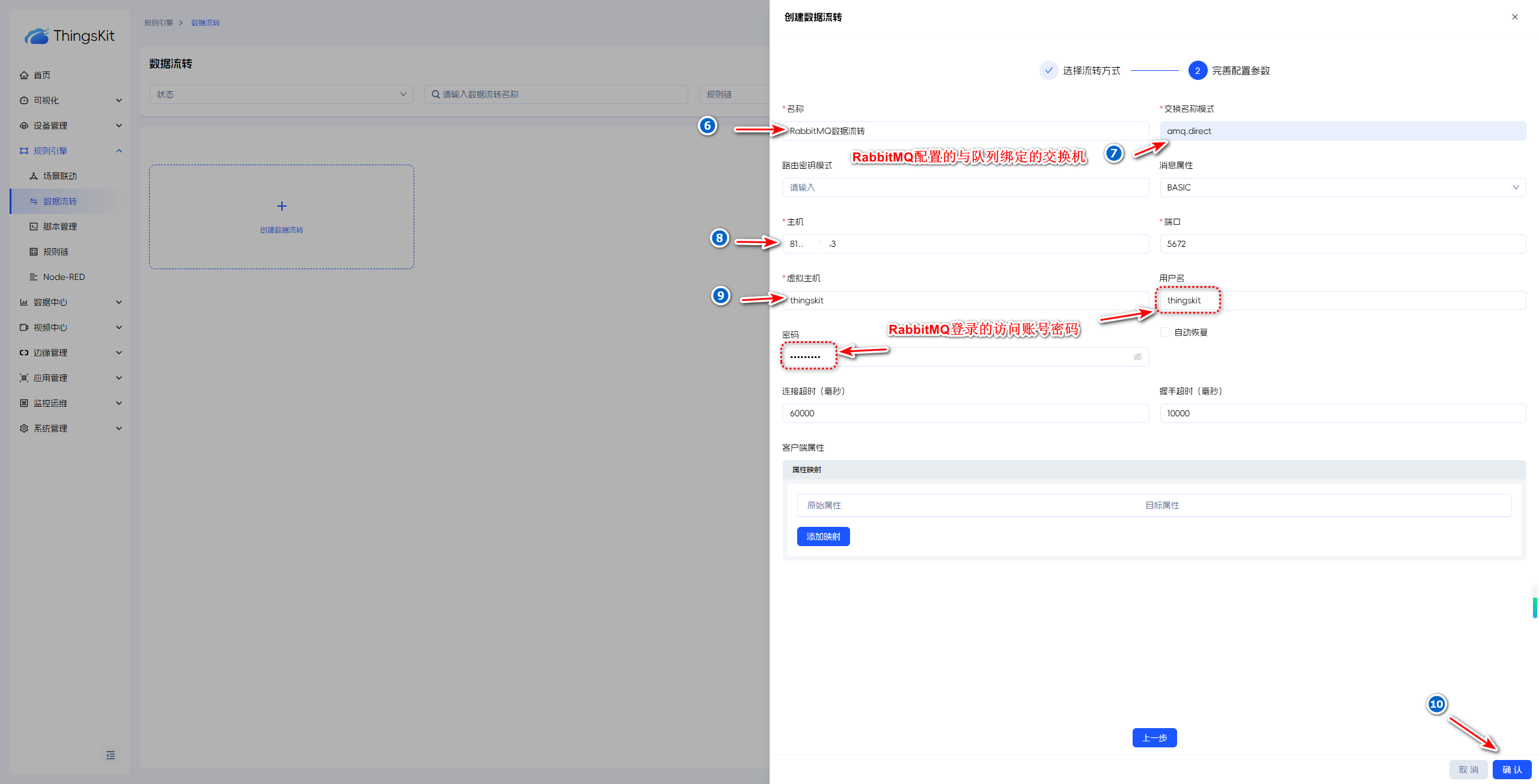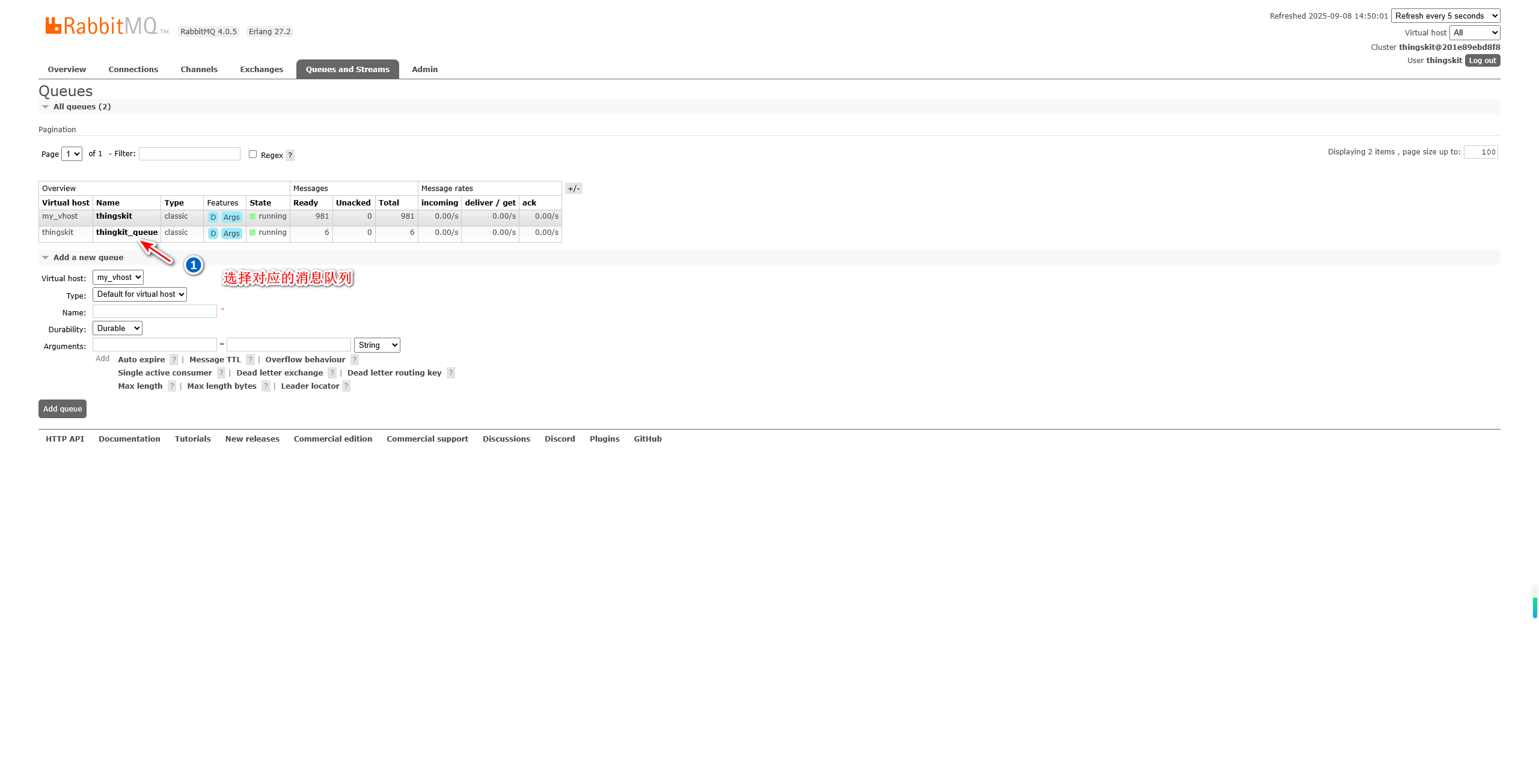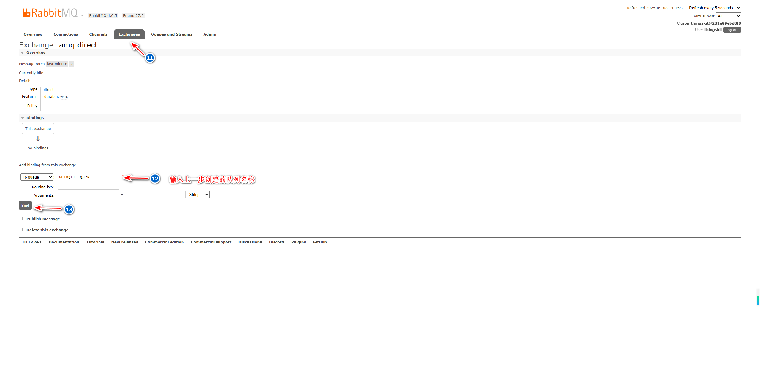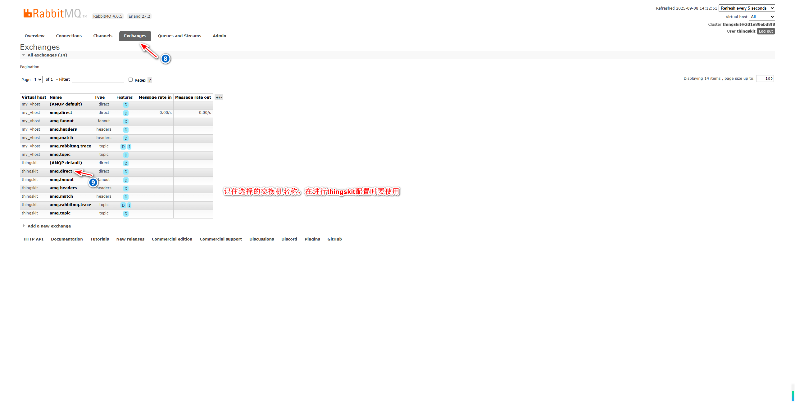 交换机模式:amq.direct、amp.fanout、amq.headers、amq.match、amq.rabbitmq.trace、amq.topic。队列:在创建时,使用的以上哪种模式创建的,在thingskit数据流转配置时也要输入。