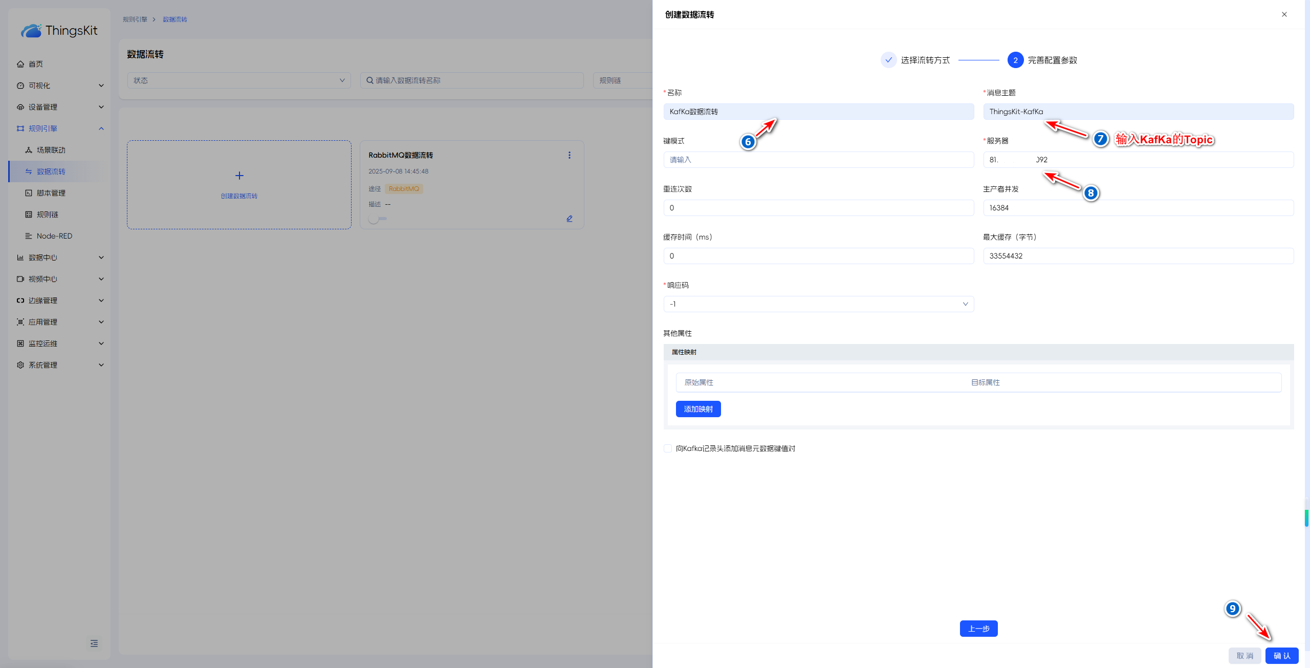 docker exec -it kafka1 bash #kafka1 请更改为自己的容器名称或IDkafka-topics.sh --create --bootstrap-server localhost:9092 --topic ThingsKit-KafKa --partitions 3 --replication-factor 1kafka-topics.sh --bootstrap-server localhost:9092 --list平台配置